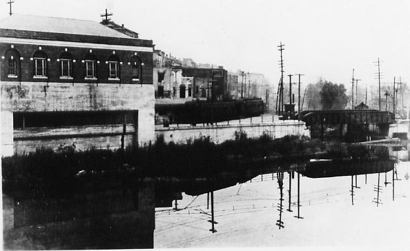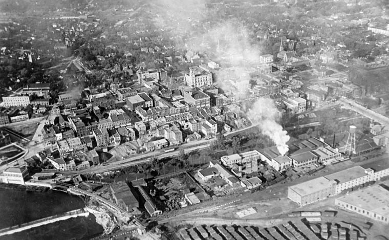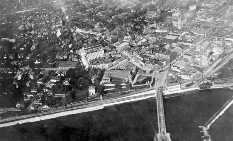 This is an aerial photo of Downtown Brantford taken in 1919. The Grand River is at the bottom of the photo, with the Lorne bridge crossing the river. The Lake Erie & Northern runs along the side of the river from left to right, and the B&H/LE&N station is the large building over the tracks next to the bridge. (Photo courtesy of Library and Archives Canada, used with permission)