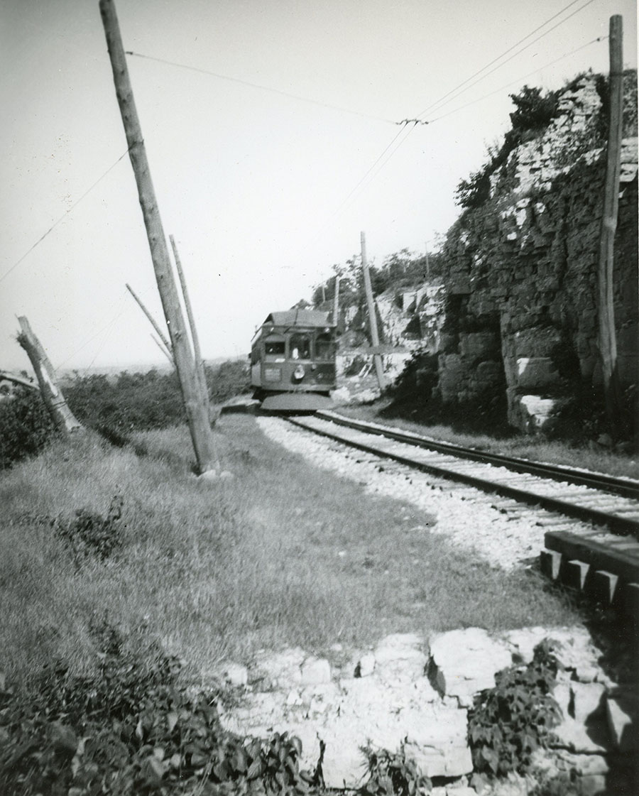 B&H #225 crossing the gravel quarry just east of present day Scenic drive, date unknown. The Kuhlman Company built this car in 1907. It was originally numbered #325, and was scrapped in 1933. (Photo from the James McFarlane Collection, courtesy Trevor Parkins-Sciberras, used with permission)
