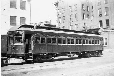 B&H 240 at Hamilton Terminal Station, summer 1928. The Cataract Company built #240 in 1923 out of the leftover pieces of several other cars. The roof is from HRER #307, and the trucks are from #210. This car was scrapped in 1933 (Photographer unknown)