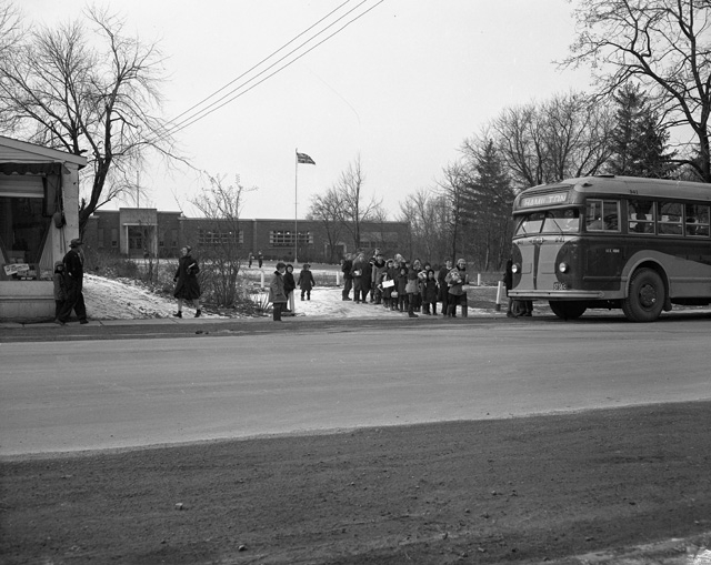 CCL #941 on school bus duty in front of Ancaster Memorial School on Wilson St on Feb 3, 1951. (Photo courtesy of the Hamilton Public Library, Local History & Archives,)