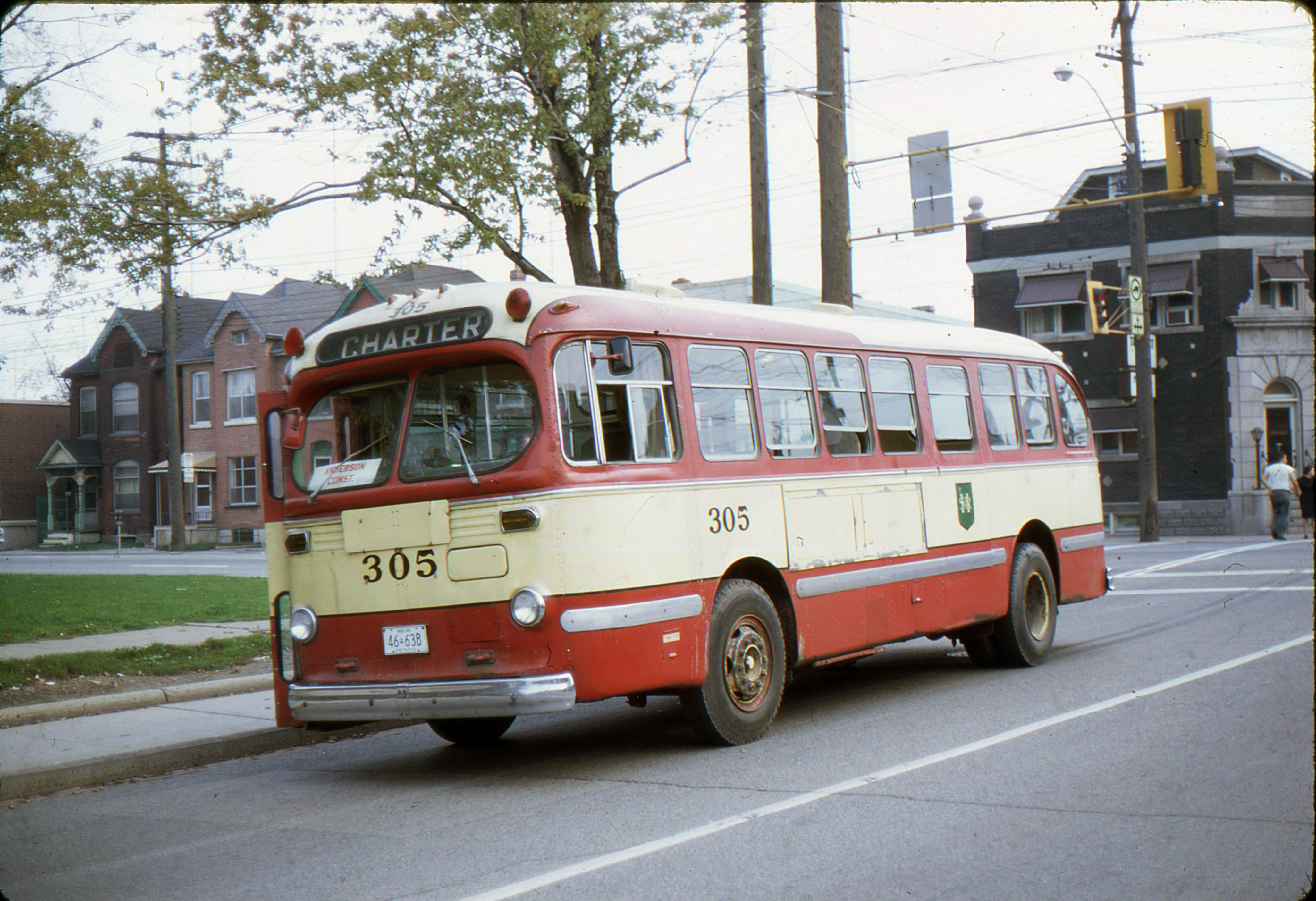 HSR #305 on school bus duty on King St E. at West Ave in May 1969, along with HSR 712. (Photo by Mike Harrington, used with permission)