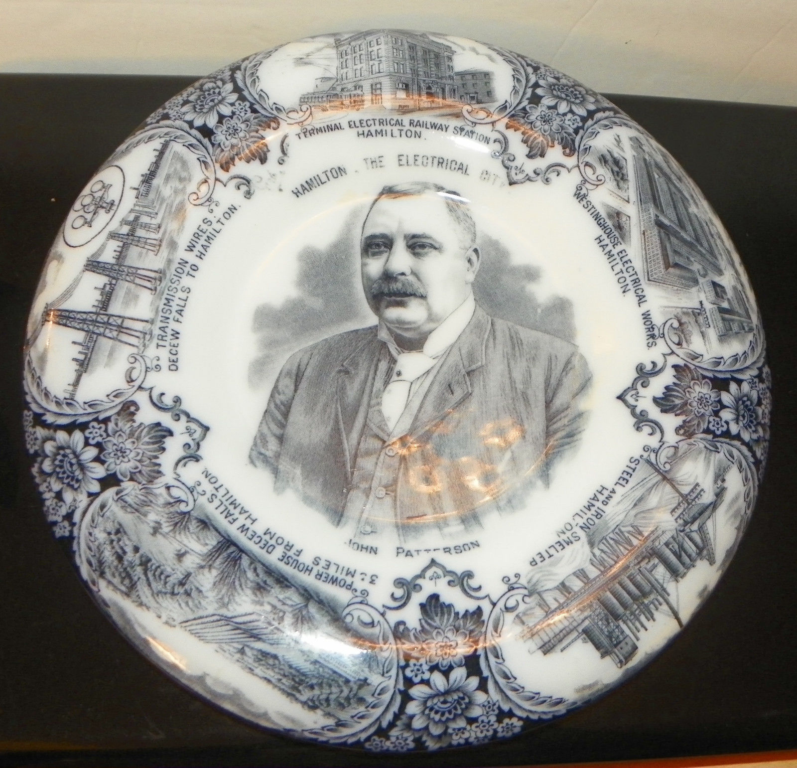This commemorative plate was made in honour of John Patterson, Hamilton industrialist and one of the founders of the Cataract Company. On the plate's rim are drawings of five of his major industrial projects. At the bottom left is the Decew Falls hydro-electric station, on the left are the first long-distance power lines in Canada, and at the top is the Hamilton Terminal Station.