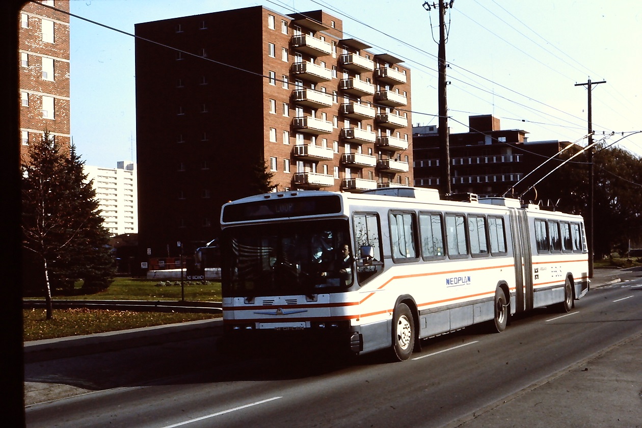 This articulated, dual mode (either diesel or electric) bus ran as a demonstration bus in Hamilton starting on November 24, 1986. The demonstration was unfortunately halted when slush from an early winter storm on December 3 clogged the bus's air intake, overheating the engine and causing the bus to break down.