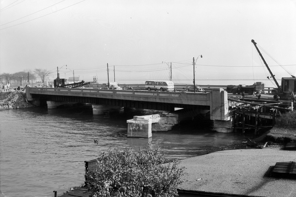 An HSR bus crossing the Humber River heading east for Parkside loop on October 25 1954. Notice the heavy damage to Lakeshore Blvd on the right. (Photo courtesy of the Toronto Public Library, Digital Collections)