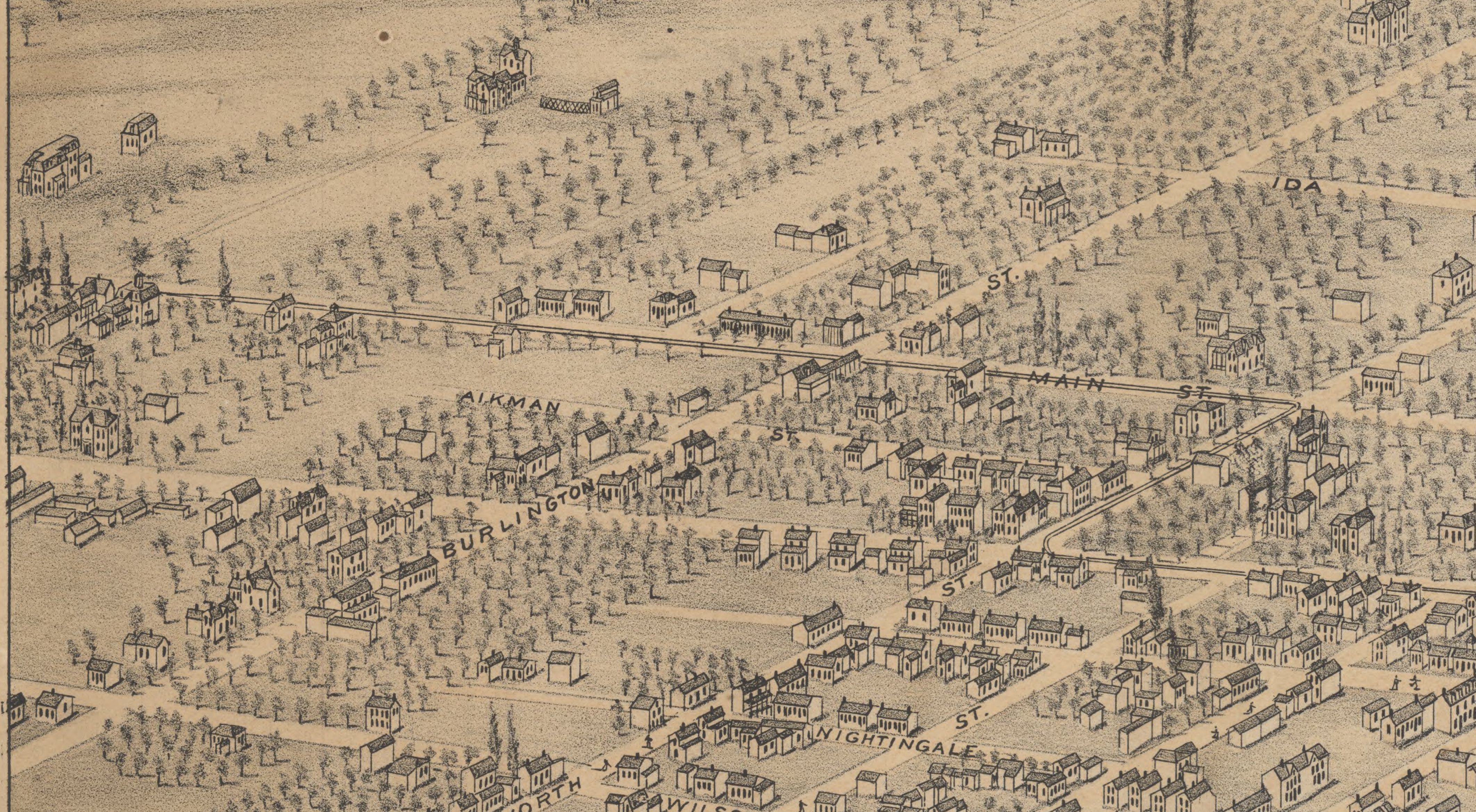 Bird's-eye view of eastern Hamilton in 1876, looking southeast. Main St meets the edge of the map approximately where Eastbourne Ave is today. The East Hamilton route actually continued off the end of the map for another kilometre. (Image taken from a larger map located here).