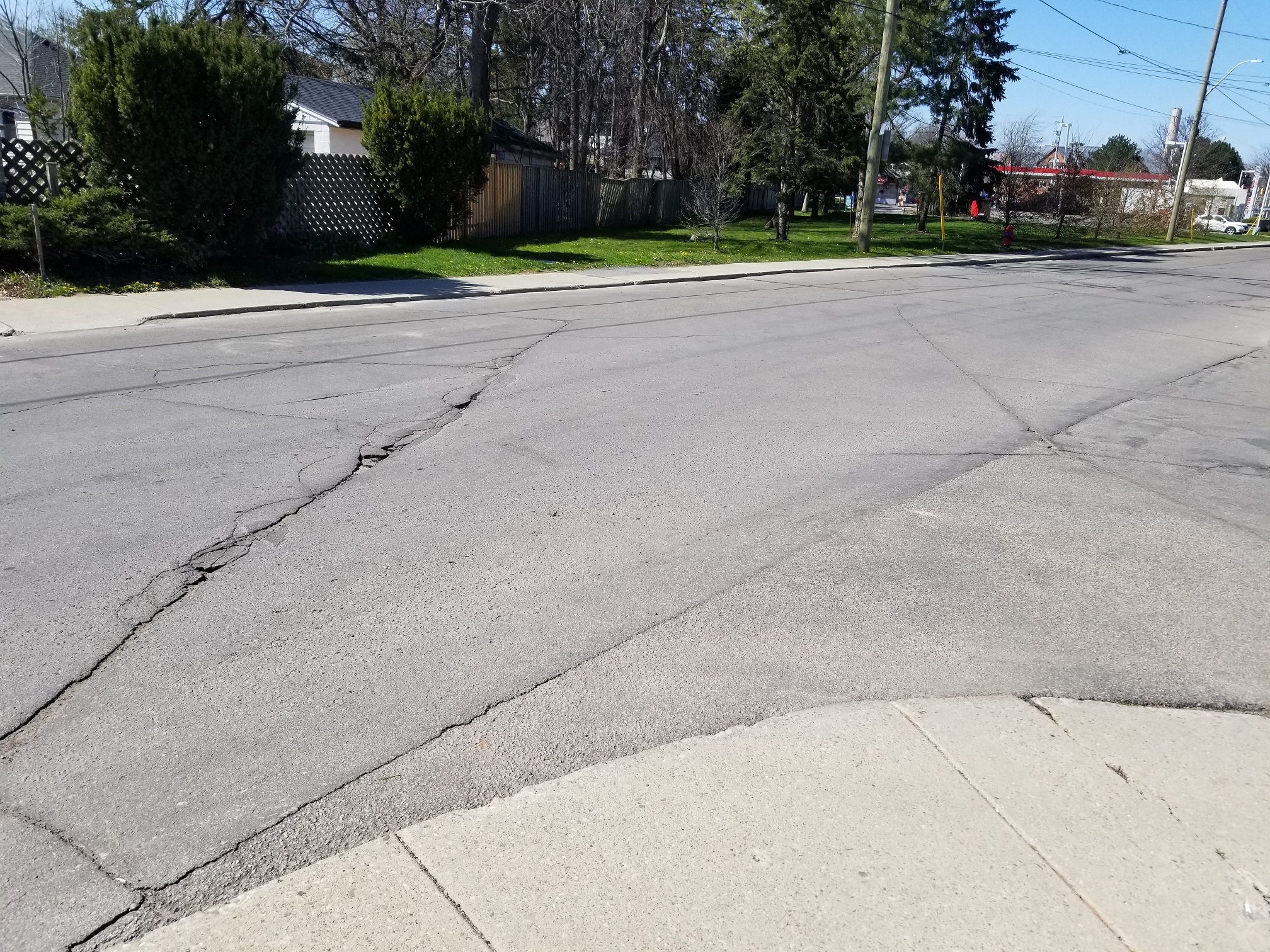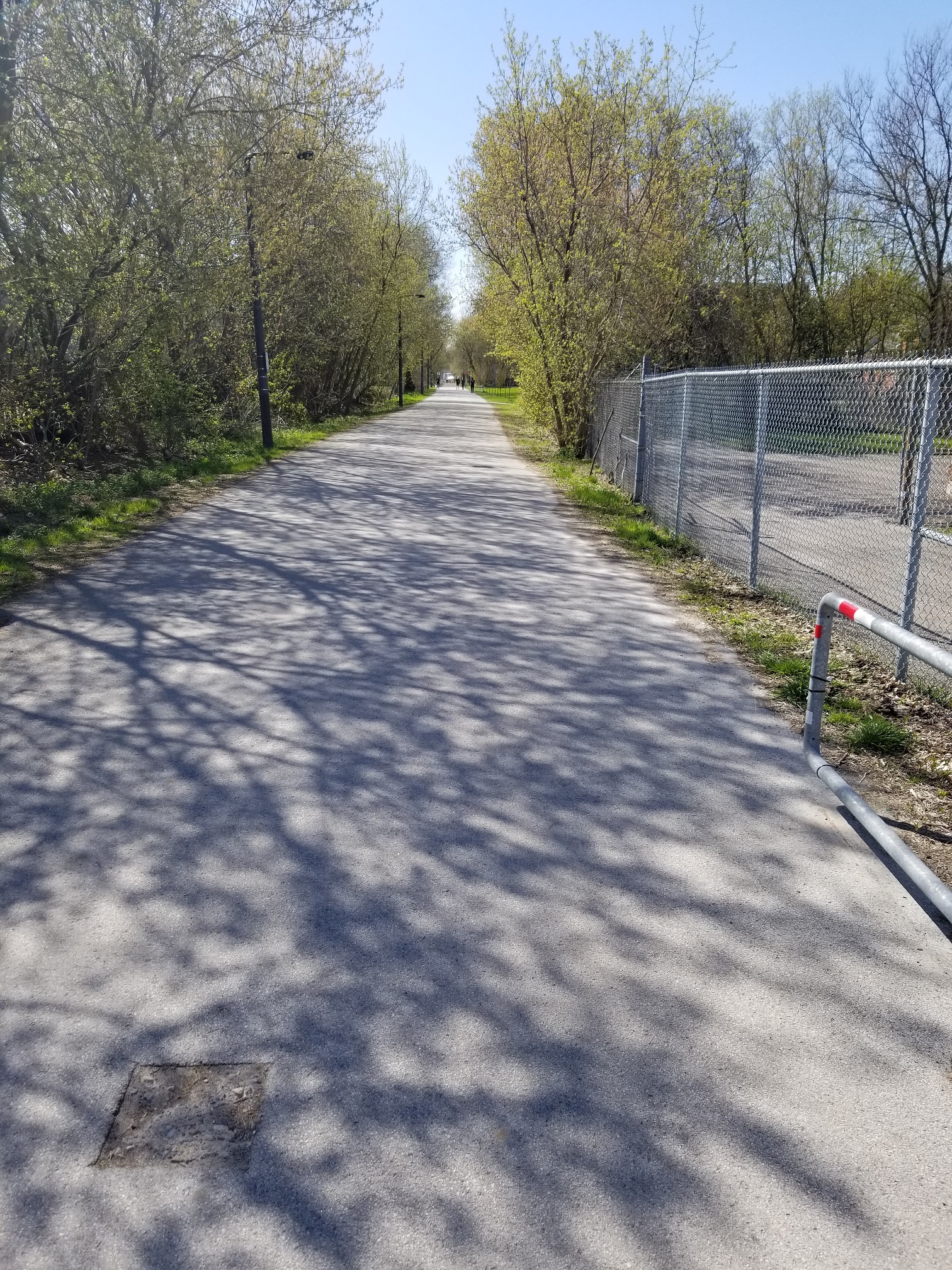Looking north at the crosswalk at Sanders Blvd and Cootes Dr. This is the start of the Dundas Bike Trail, which is built partly on top of the old roadbed.
