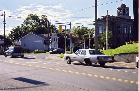 The intersection of Dundas Street and Main Street. The H&D turns at the intersection, heading northwest past the Dundas Town Hall on the right. Click here to see the TH&B in action at this location.