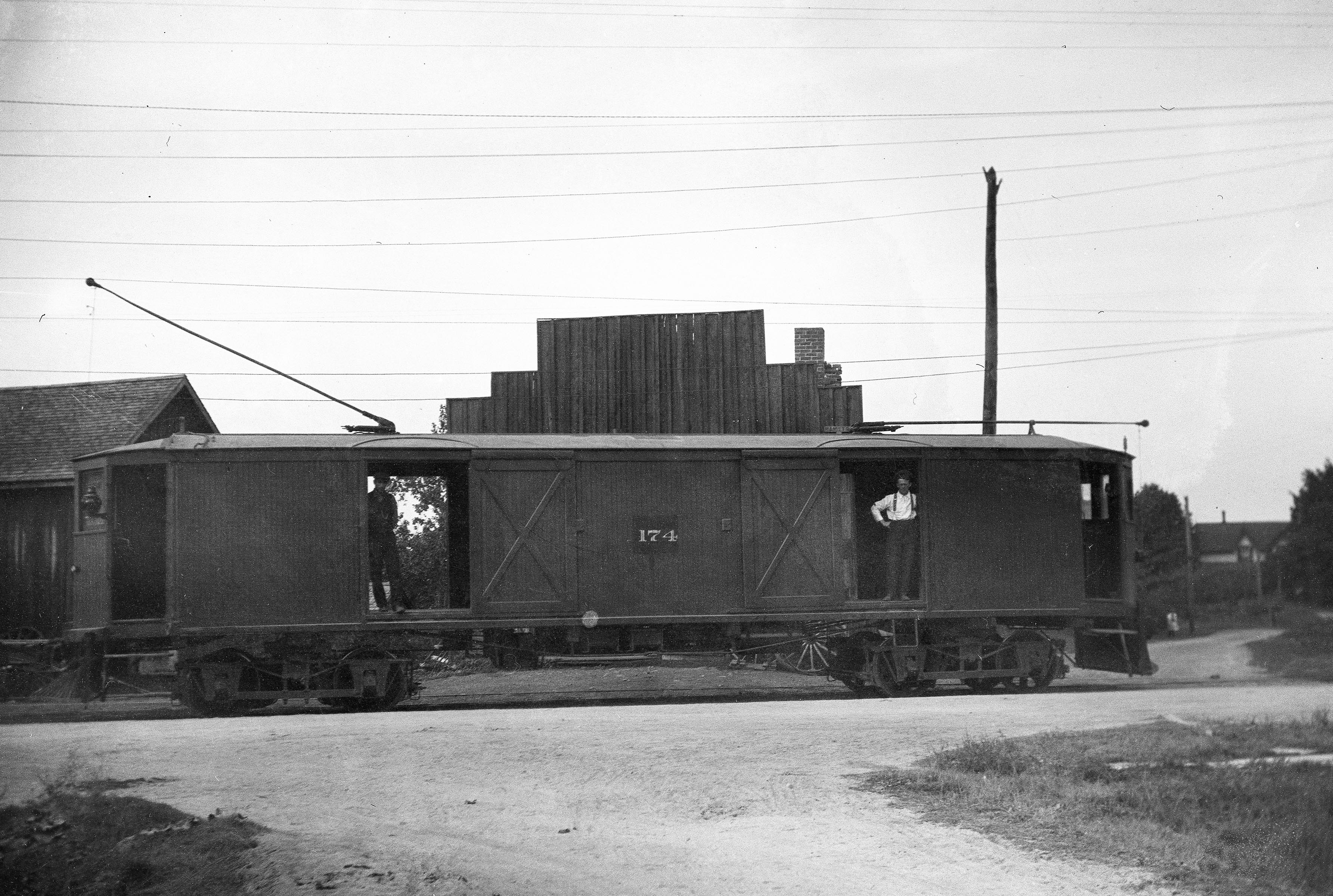 CT states that the HG&B ordered from the Ottawa Car Company (a subsidiary of Ahearn & Soper) “four 32-foot passenger cars numbered 15-18.” #15-18 were renumbered to #156-159 at the time of the Cataract Company takeover of the HG&B. #159 was retired shortly after for reasons unknown, and replaced by #159:2 (see below). The other three cars were rebuilt in 1913, and scrapped in 1932. It also states that the HG&B bought “one smaller single-truck car (no. 13, probably intended for a projected suburban service),” which was later converted into a freight car.