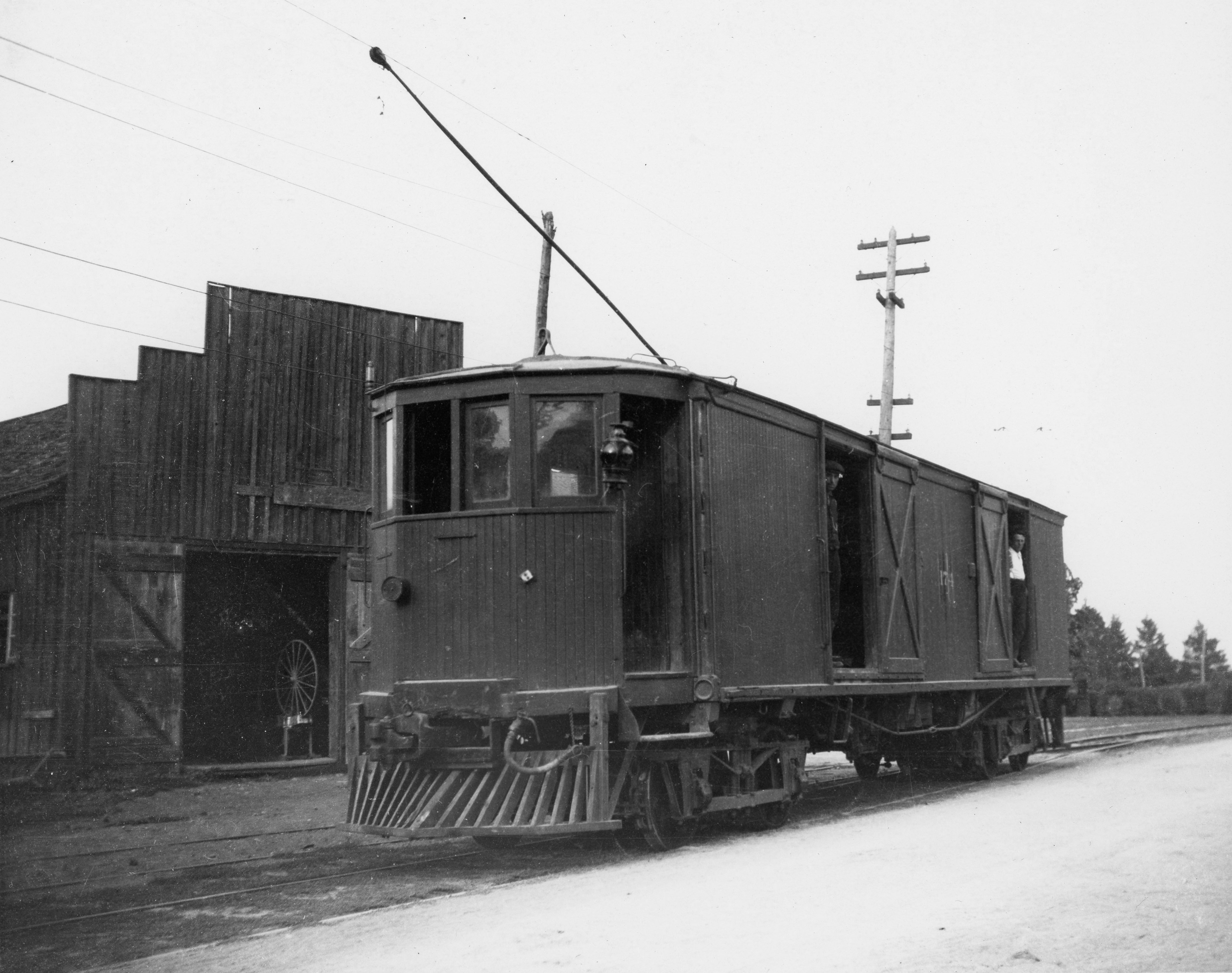 One of the HG&B's freight motors is shipping boxed fruit trees from the Helderleigh Fruit Packing House in Winona in the Spring of 1897. (Photo courtesy of the Grimsby Museum)