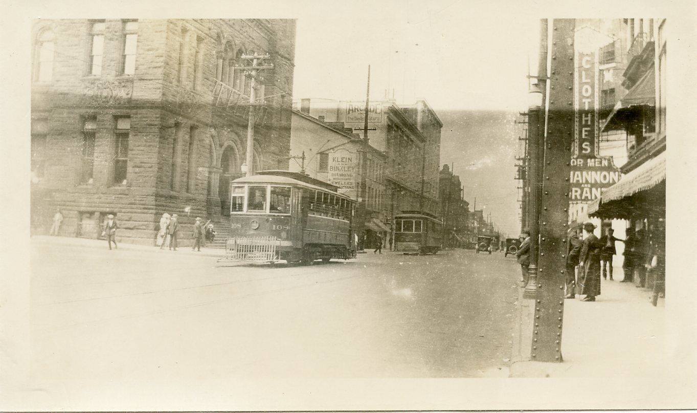 HSR #108 heading southbound on James at York on the Incline Railway route. Date unknown, but city directories have 'Shannon & Grant' at this location between 1923 and 1926.