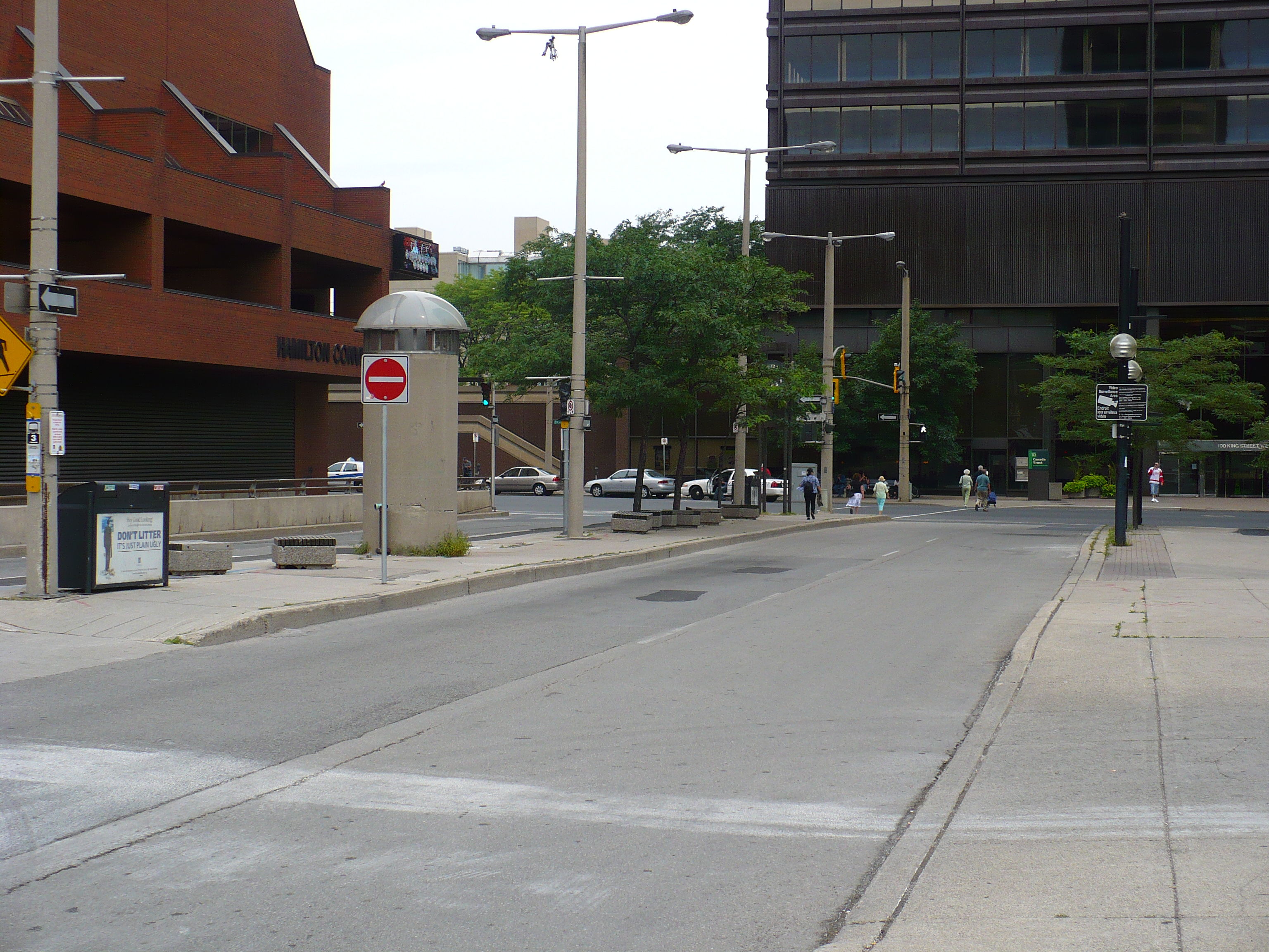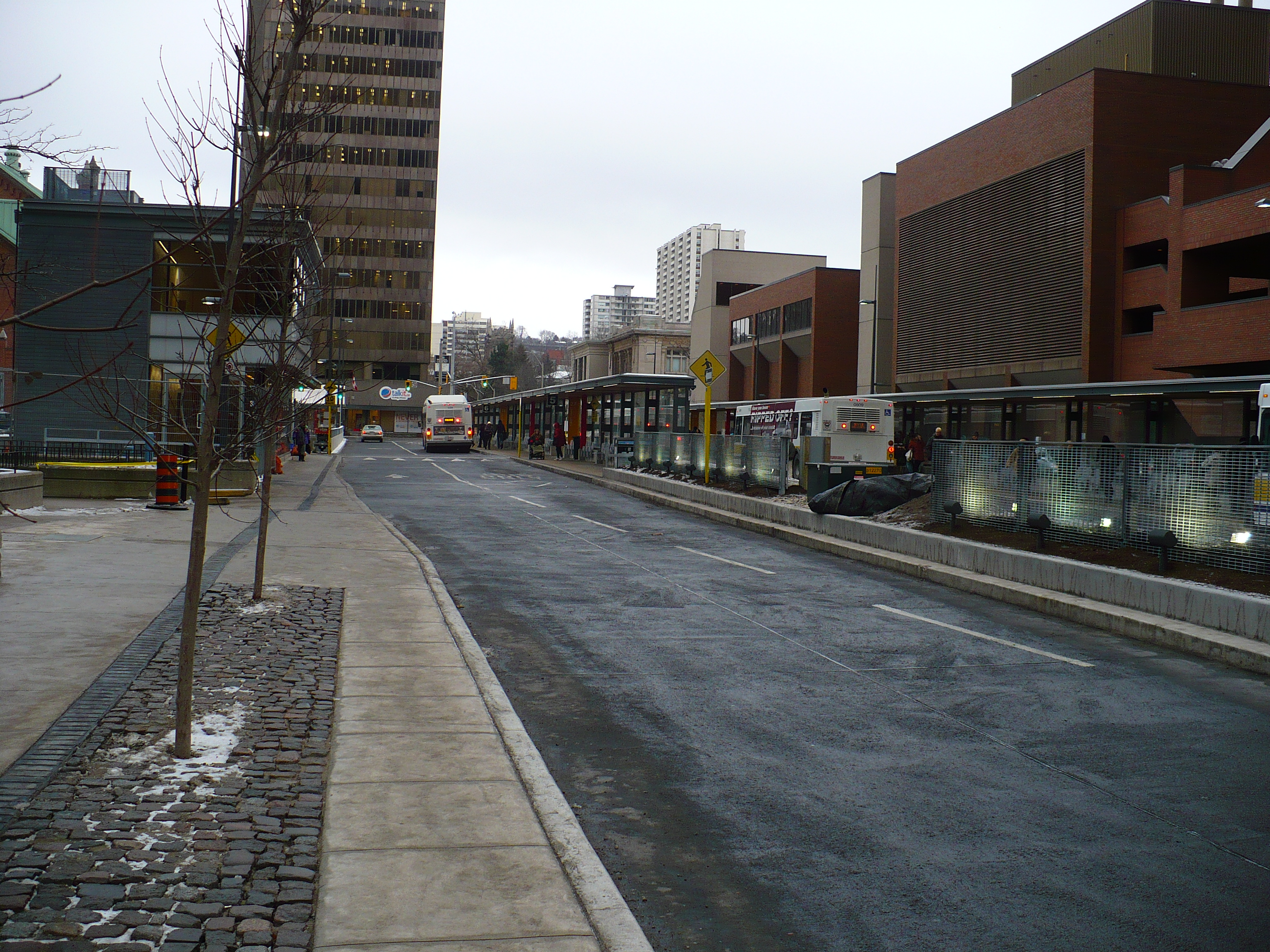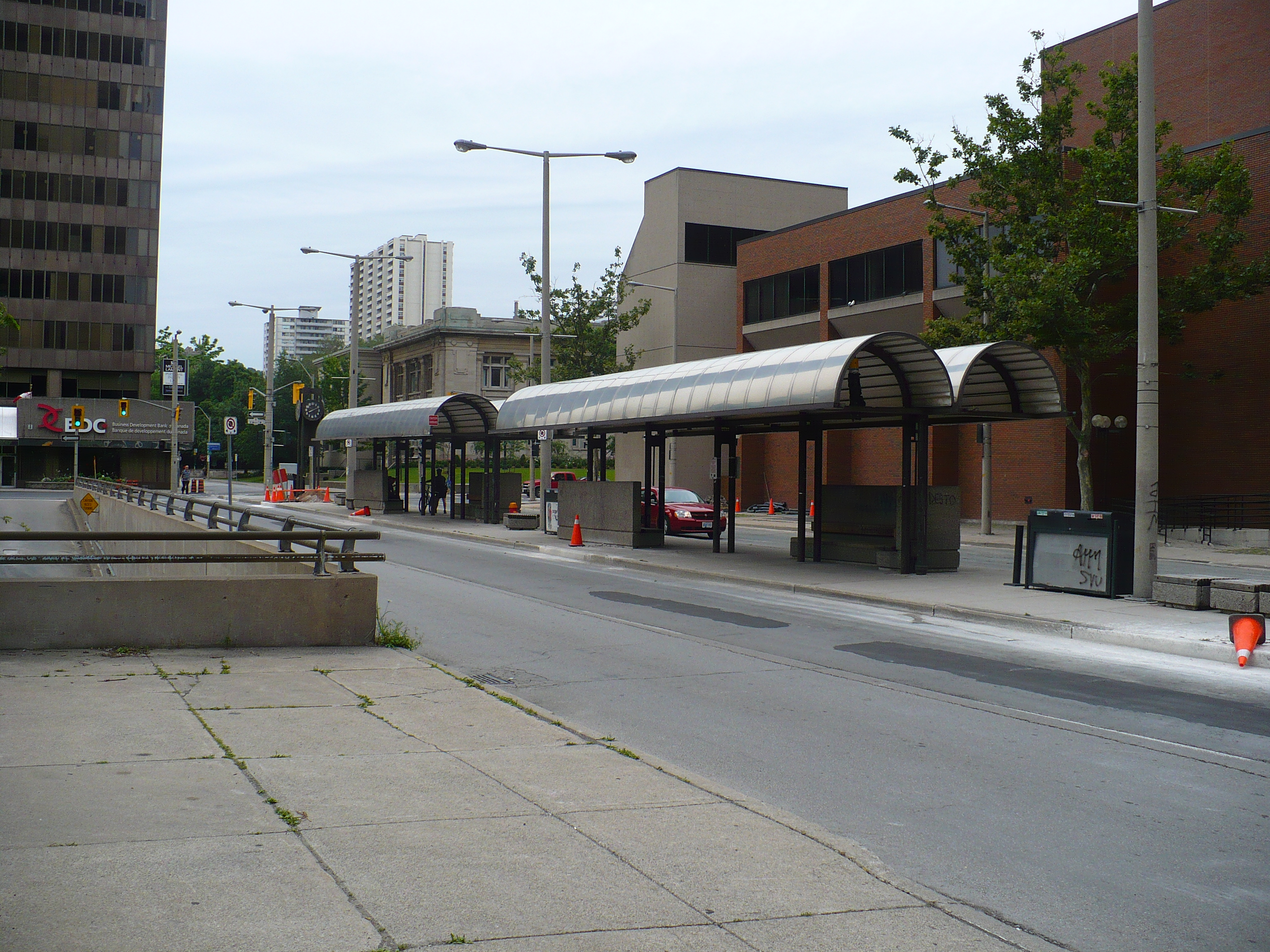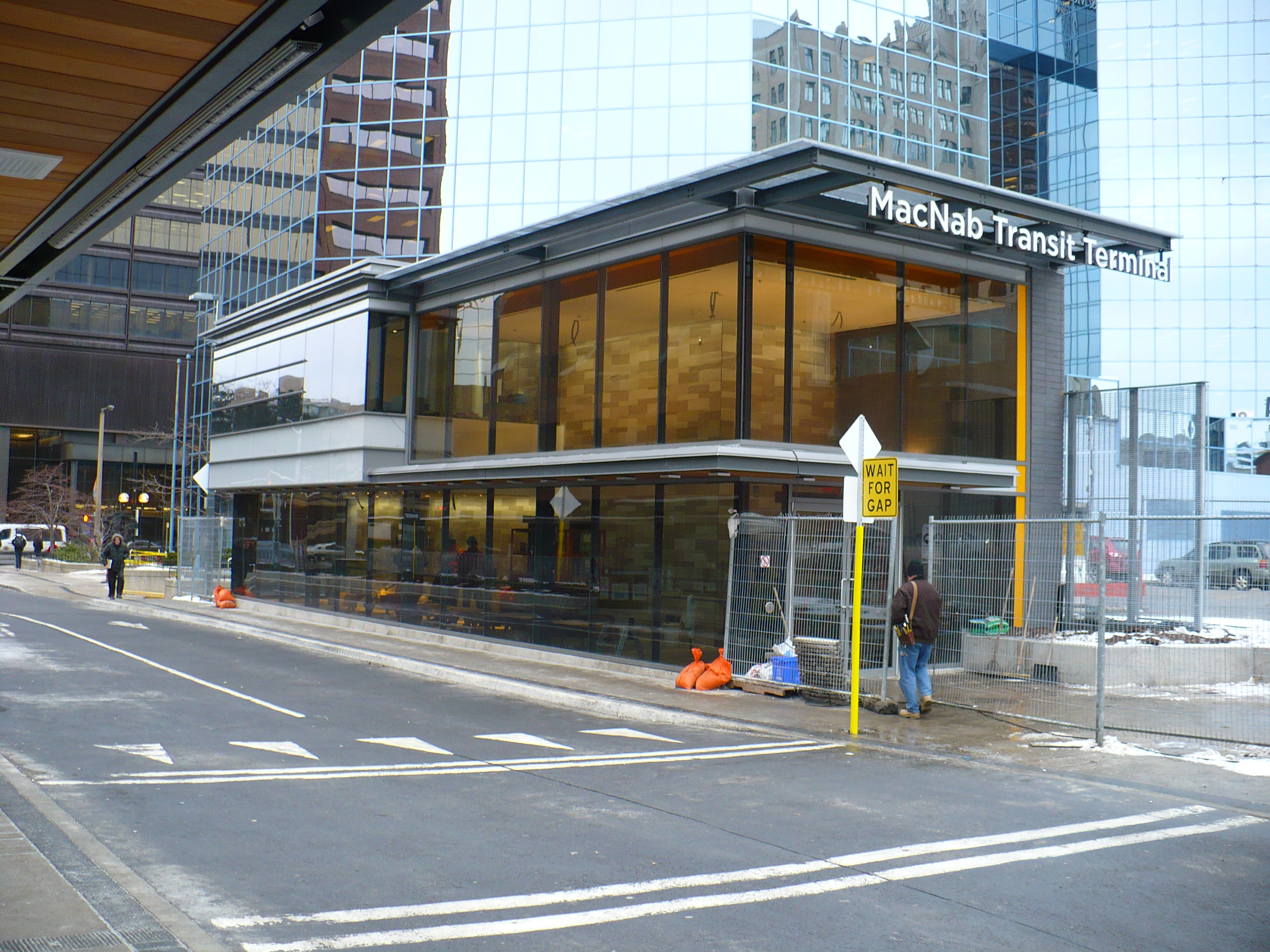 In the late 2000's, the City of Hamilton planned a revitalization of Gore Park, which included the relocation of the Gore Park bus terminal. The decision was made to upgrade the MacNab terminal and move all of the bus routes that ended at Gore Park. The New MacNab Terminal would include green roofs, a terminal building with washrooms and an info centre for riders. An early proposal that was later abandoned would have involved an even larger facility, expanding the MacNab terminal to connect to James St via the parking lot on the north side of the Pigott building.