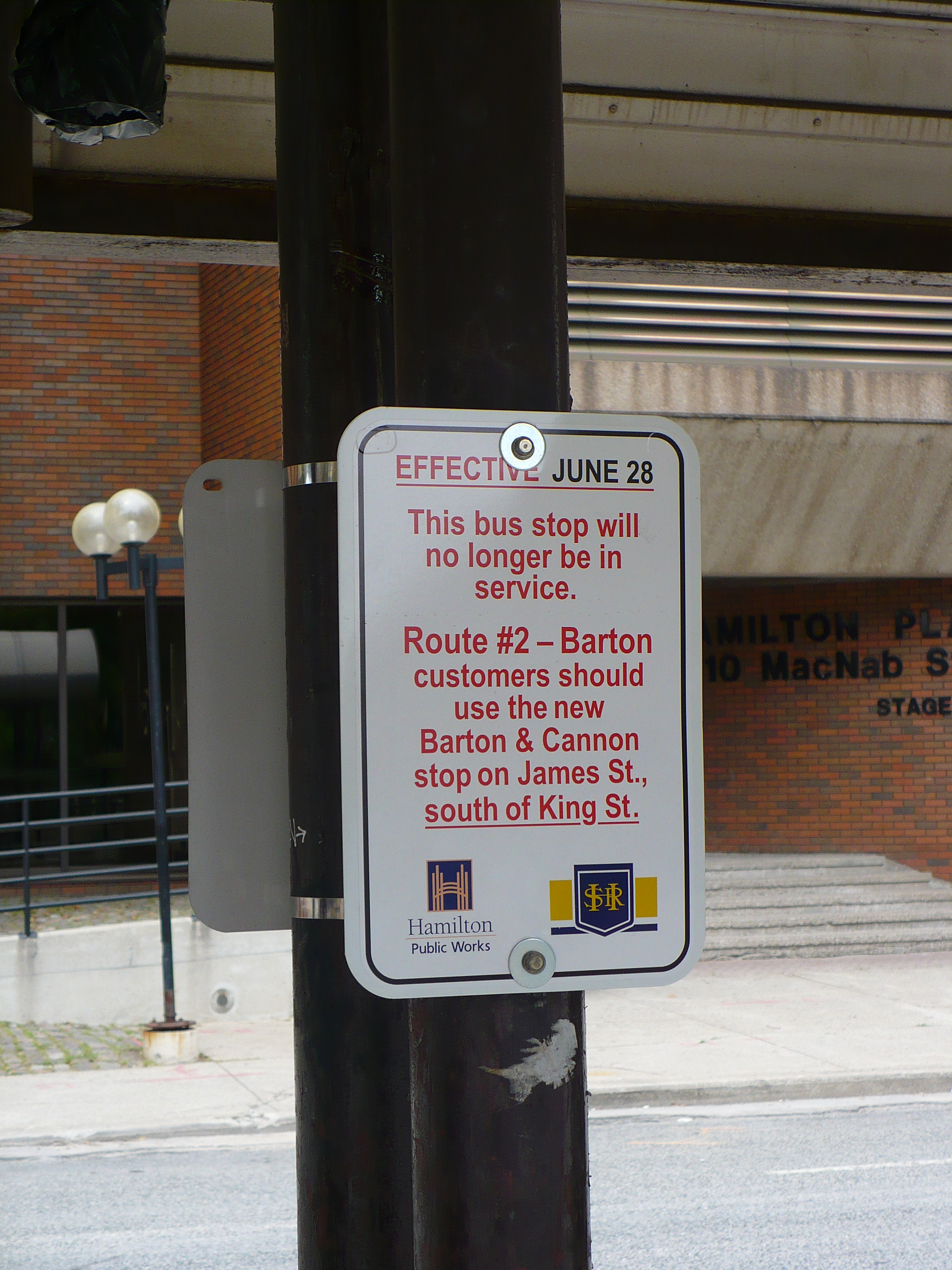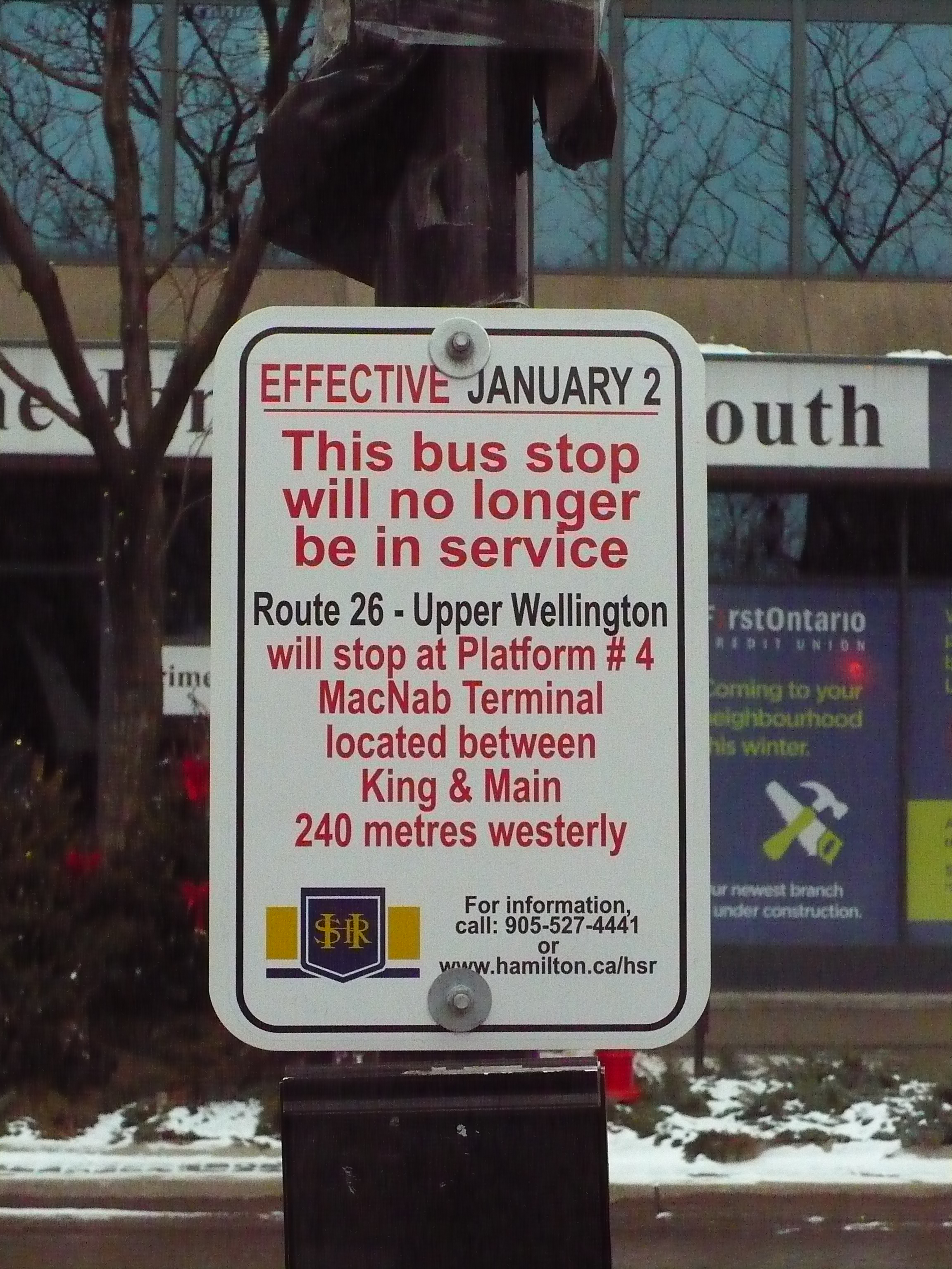 One of the OOS signs for the 26 UPPER WELLINGTON at Gore Park, directing riders to the MacNab Terminal, Jan 11, 2011