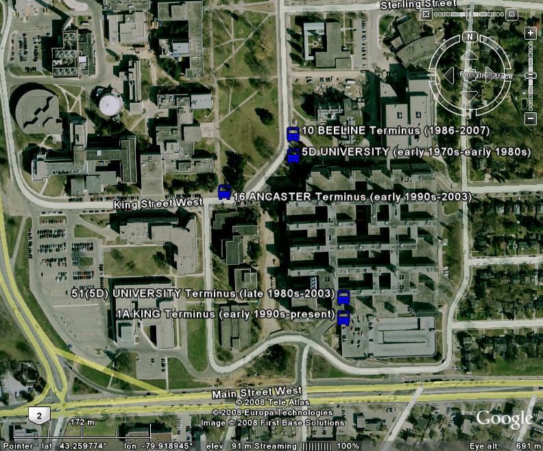 This satellite photo of McMaster University shows where various bus routes have ended over the years. (This photo predates the recent construction on the south side of campus, such as the new Main St Entrance) (Photo courtesy of Google Earth, Fall 2004)