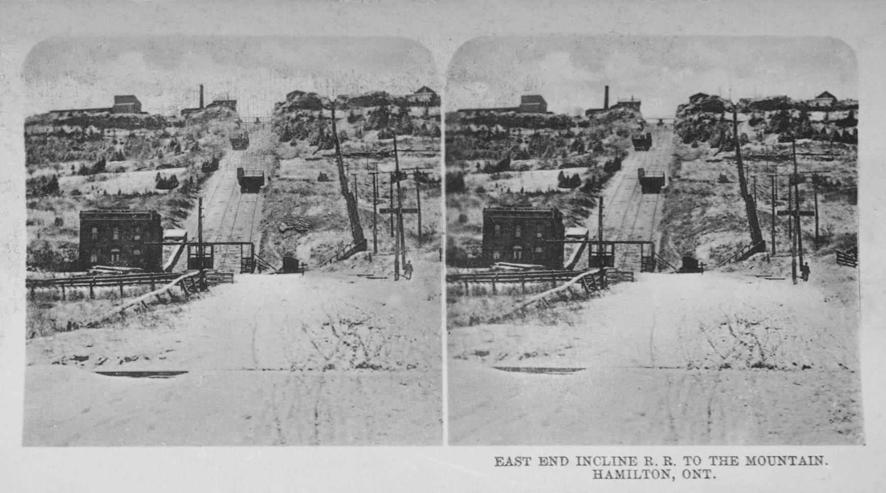 Nearing the top of the East-End Incline, circa 1899. In the background are the engine and boiler house, and the residences. All of these would be severely damaged in the 1906 fire. (Photo courtesy of the Hamilton Public Library, Local History & Archives, used with permission)