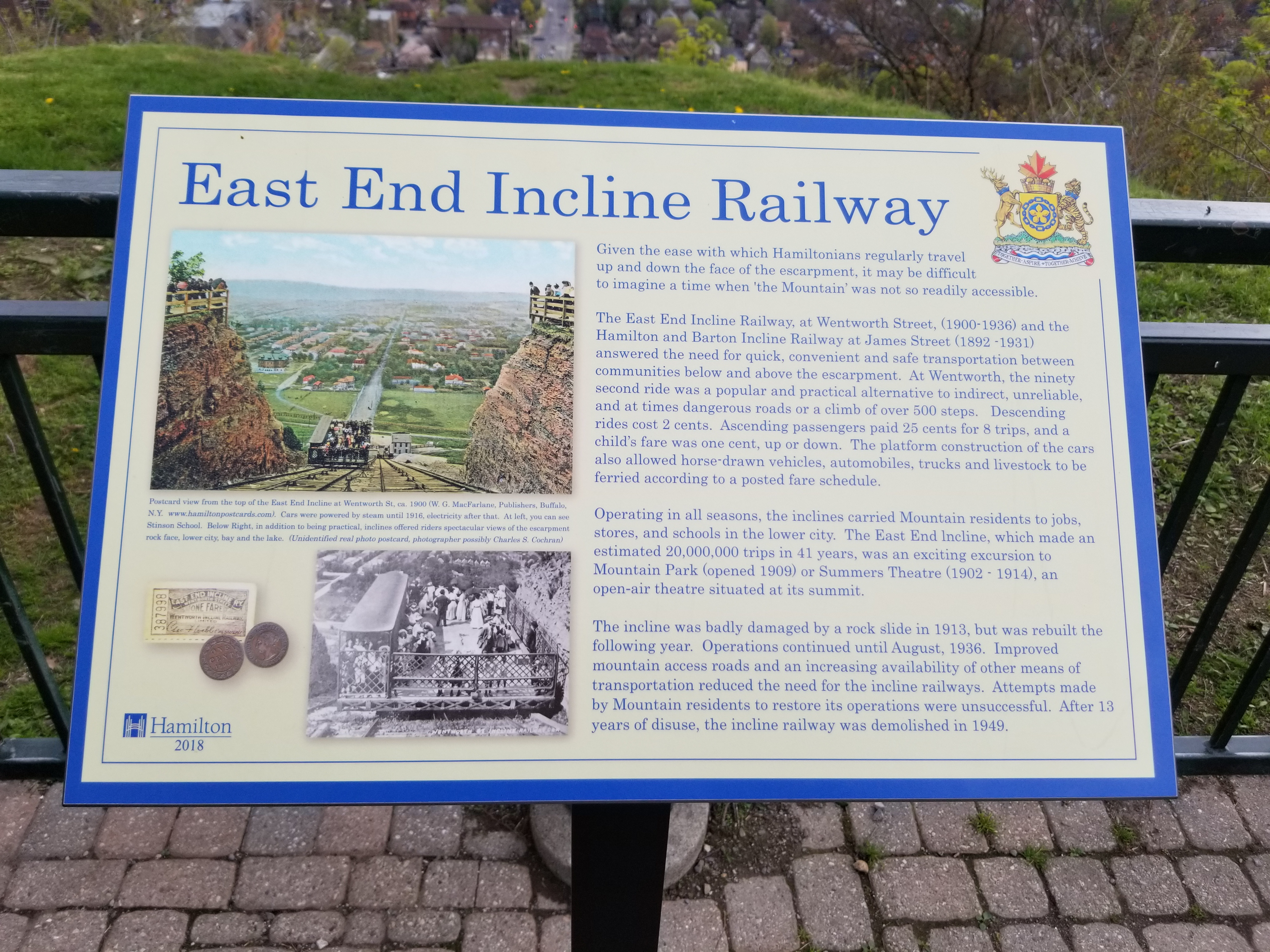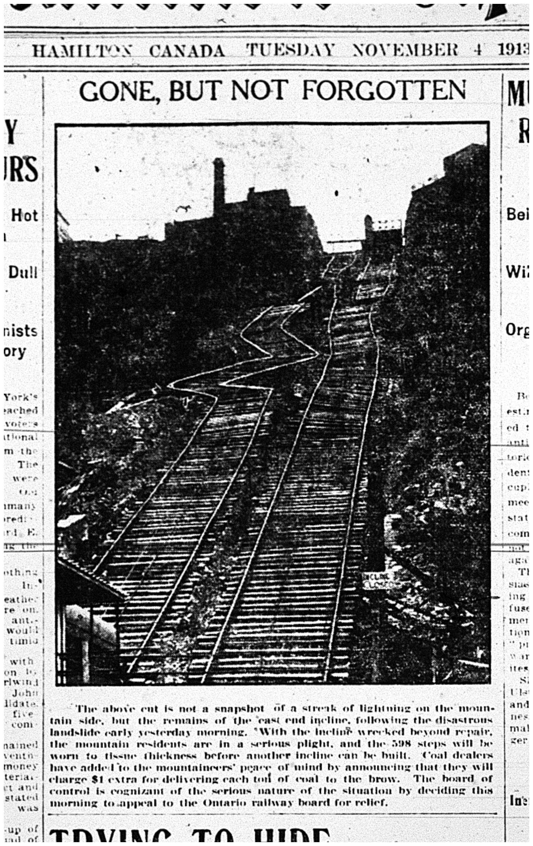 Webb would also renamed the company to the Wentworth Incline Railway (WIR). Regardless of the name change, Hamiltonians continued to refer to the line as 'The East-End Incline.' On November 3, 1913, a heavy storm unleashed a landslide that wrecked the inclined railway and put it out of commission for several months until April 1914.