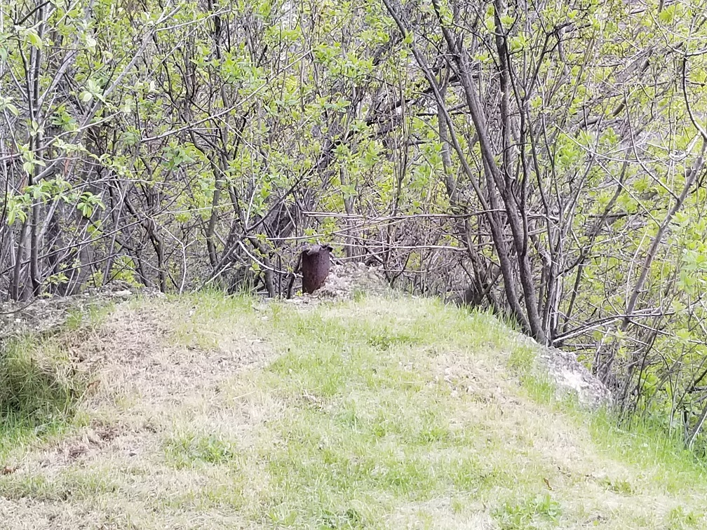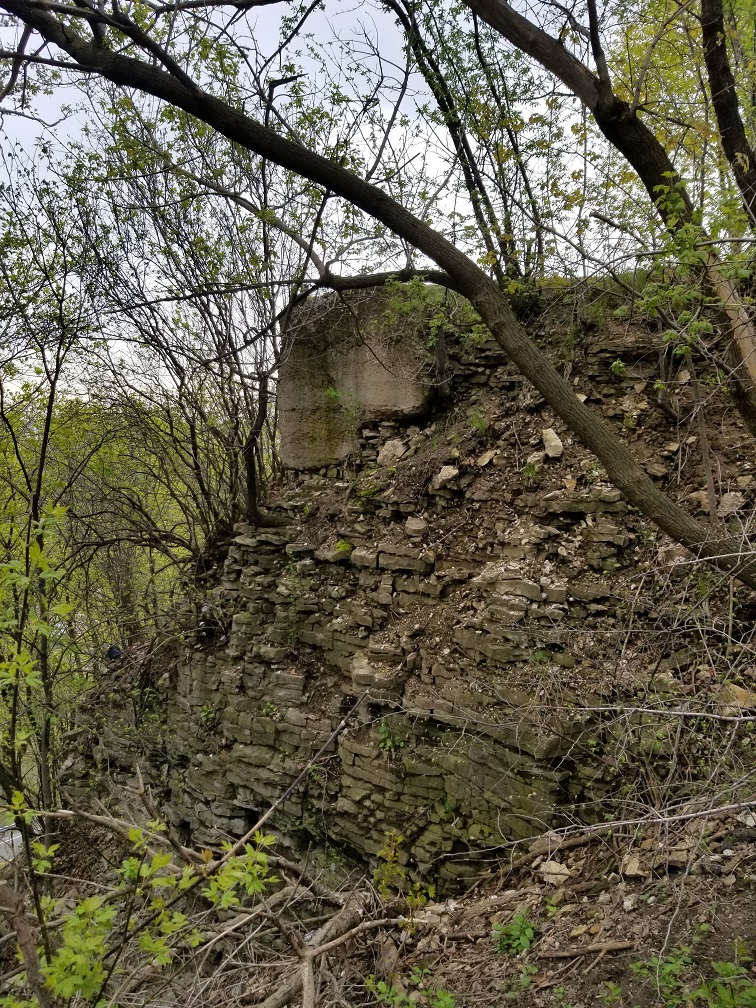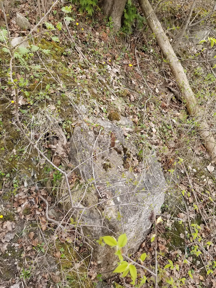 In at least one case the builders of the East end Incline took advantage of a natural rock outcrop instead of pouring a concrete base. Note the metal bar sticking out of the rock. May 16, 2019