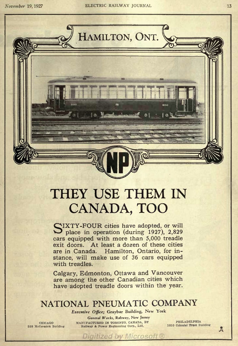 This ad featuring the NSC Streetcar was created by the National Pneumatic Company, a manufacturer of treadle (foot activated) doors. (From Nov 19 1927 issue of Electric Railway Journal)