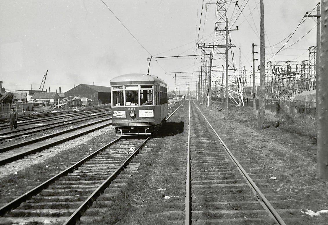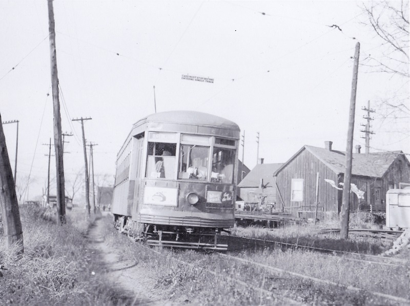 HSR #500 on the Burlington St Right-Of-Way crossing Beach Rd in 1947. (From the Al Paterson collection, used with permission)