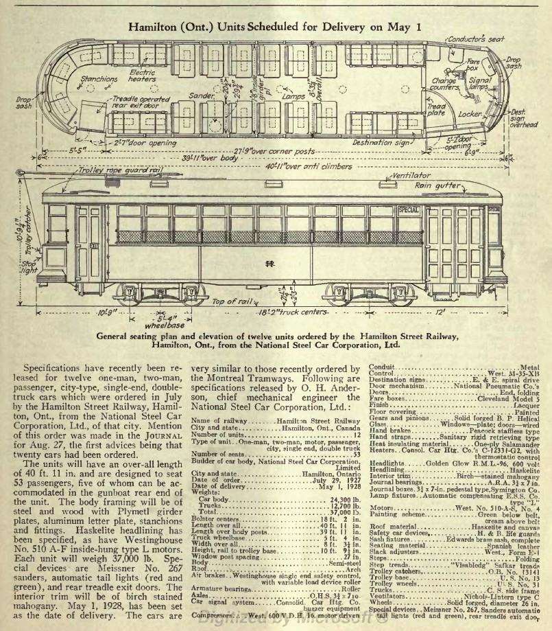 Drawings and specifications of the NSC streetcar. (From Nov 12 1927 issue of Electric Railway Journal, pg 925)