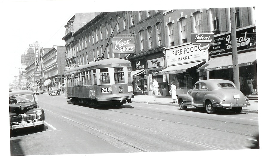 HSR #504 on King St W in the middle of Westdale, August 4th 1949, the last day of service for streetcars on King St West. (From the Richard Vincent collection, used with permission)