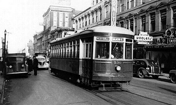 HSR #530 heading southbound on James St N between King William St and Rebecca St, date unknown. After retirement, the body of HSR #530 would be sold to a private owner and moved to Port Colborne, where it was later scrapped. (From Dave’s Electric Railroads, used with permission)