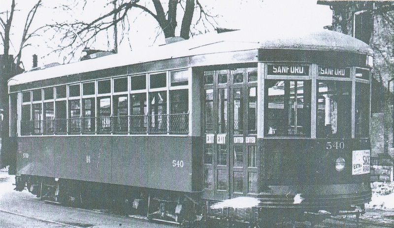 HSR #540 at Sanford yard. This is the last paint scheme the streetcars would wear, the Canada Coach two-tone green.(From Dave’s Electric Railroads, used with permission)