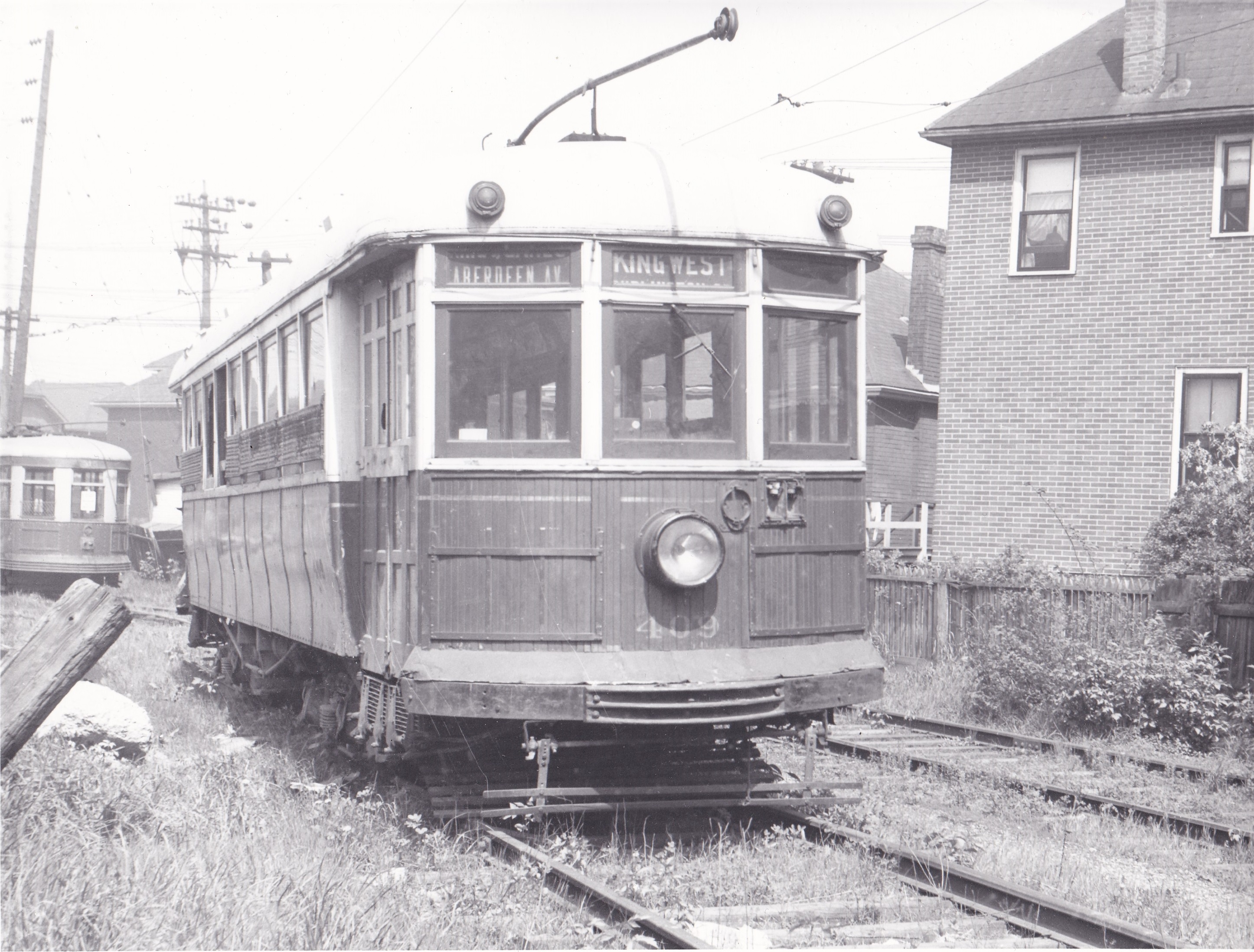 HSR #411 at Queen and Aberdeen in Spring 1941. On the left is the former right of way of the The Brantford & Hamilton Electric Railway (B&H) (Photo courtesy of Library and Archives Canada, used with permission)