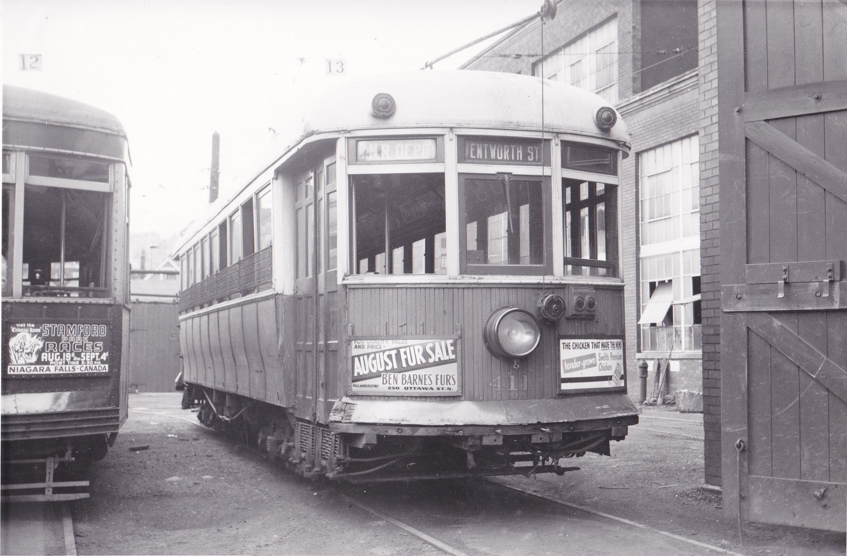 Built in 1910 by the Ottawa Car Company, these 9 cars served the city of Hamilton for almost 40 years. These were the first streetcars built to the PAYE (Pay As You Enter) configuration on the HSR (4 existing HSR cars had been already rebuilt). The first of the Ottawa DEDT cars were to have arrived in April 1910, but delays at the Ottawa Car Company plant delayed them until the beginning of July, when they entered service on the King East & Barton route. Originally built for two-man operation, cars #409-421 were rebuilt to one-man operation in the 1930s. The unconverted cars were scrapped in 1932, but the 7 rebuilt cars lasted until the end of streetcar service on the HSR.