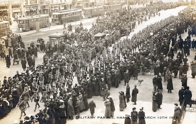 On March 18, 1916 a large military parade was held in Downtown Hamilton. This parade blocked streetcar traffic, resulting in delays. In the background of this photo are streetcars waiting for the parade to clear. From left to right are HSR #418, #411, #420, and another Ottawa-built streetcar. (Photo courtesy of the Hamilton Public Library, Local History & Archives, used with permission)