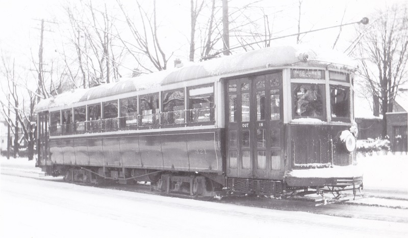 HSR #409 on York St beside Harvey Park, Feb 19, 1938. This type of shot would soon be a memory, as the tracks on York St would be torn up in 1939. (Photographer unknown)