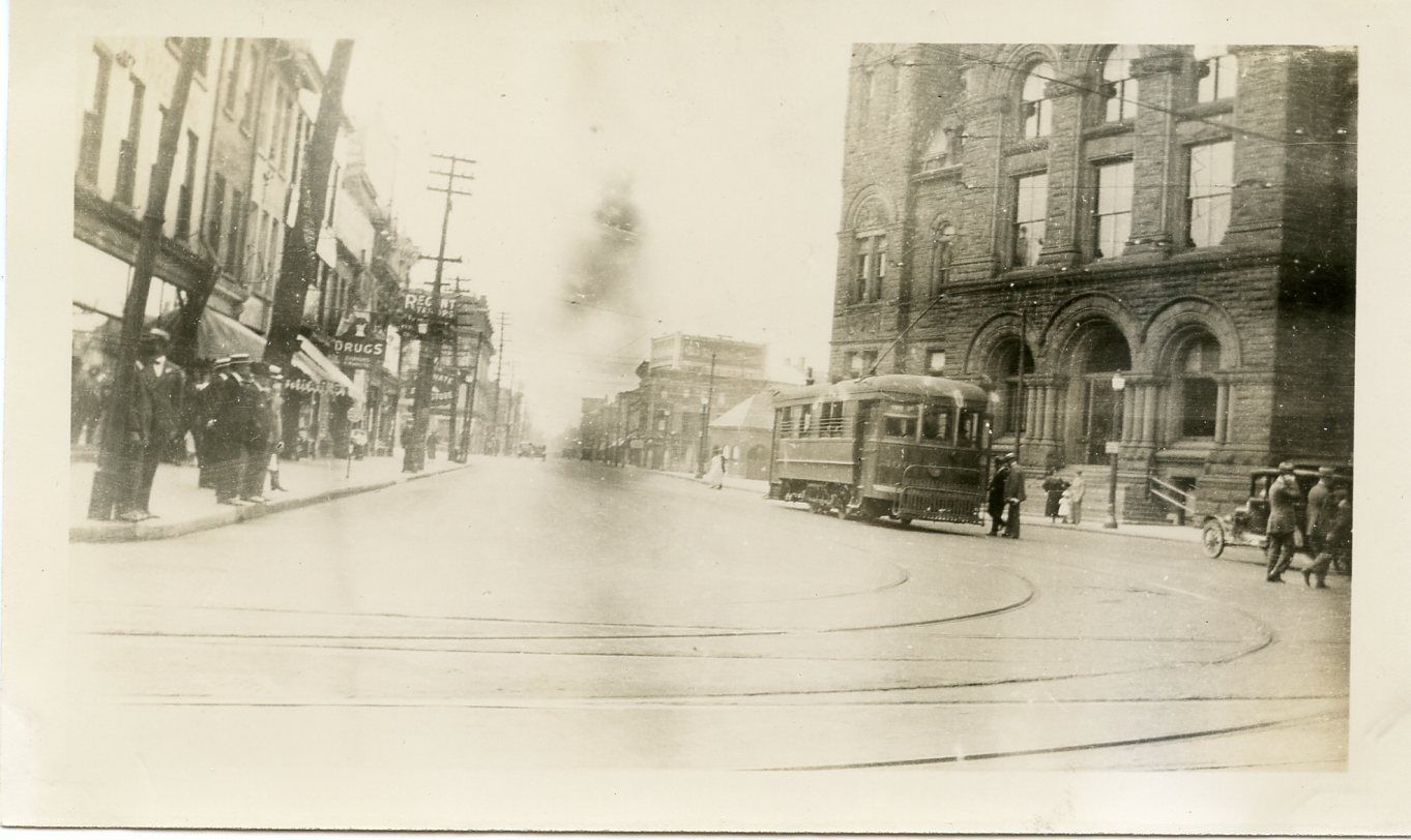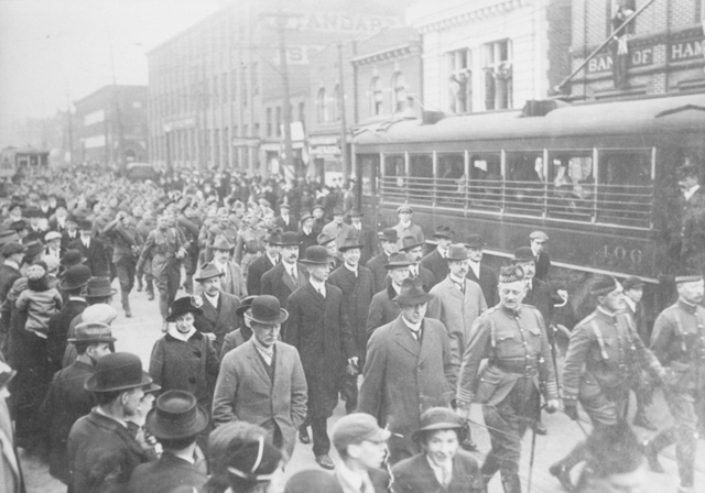 HSR #406 has been halted by a World War 1 military parade on James St North just south of Barton, date unknown. (Photo courtesy of the Hamilton Public Library, Local History & Archives, used with permission)