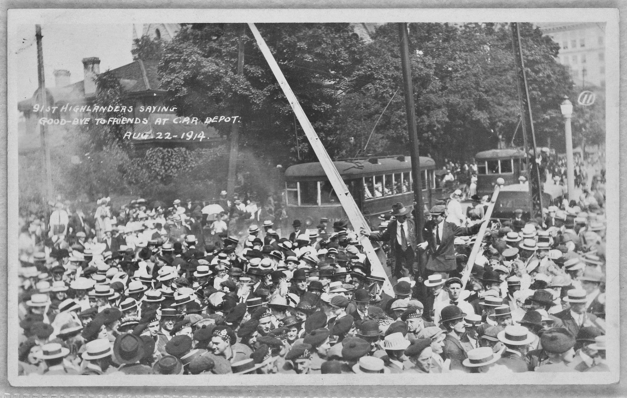 In this photo postcard HSR #408 and another Preston-built DEST streetcar are stuck in the crowd of wellwishers seeing the 91st Highlanders off at the TH&B Hamilton Station on August 22, 1914.
