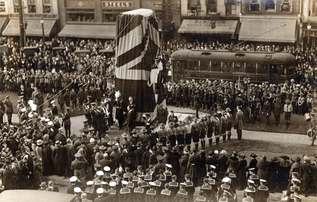 HSR #424 slowly works its way through the crowd at the unveiling of Hamilton's cenotaph at Gore park on May 22, 1923. (Photo courtesy of the Hamilton Public Library, Local History & Archives, used with permission)