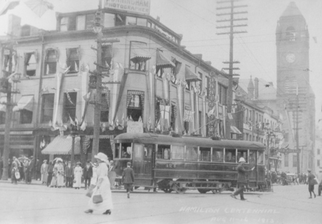 HSR #424 turning from James onto King West during the Hamilton Centennial in August 1913 (Photo courtesy of the Hamilton Public Library, Local History & Archives, used with permission)