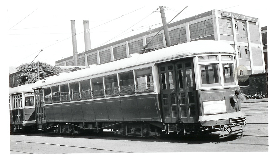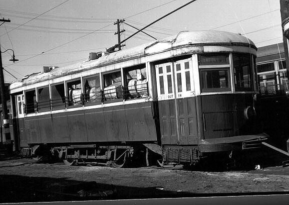 HSR #59, probably on the scrap track at the storage yard next to the East Barn. The caption reads ‘13282 Hamilton St Ry. Single Truck closed Trailer cars #46-_-52-58-59. July 192_’