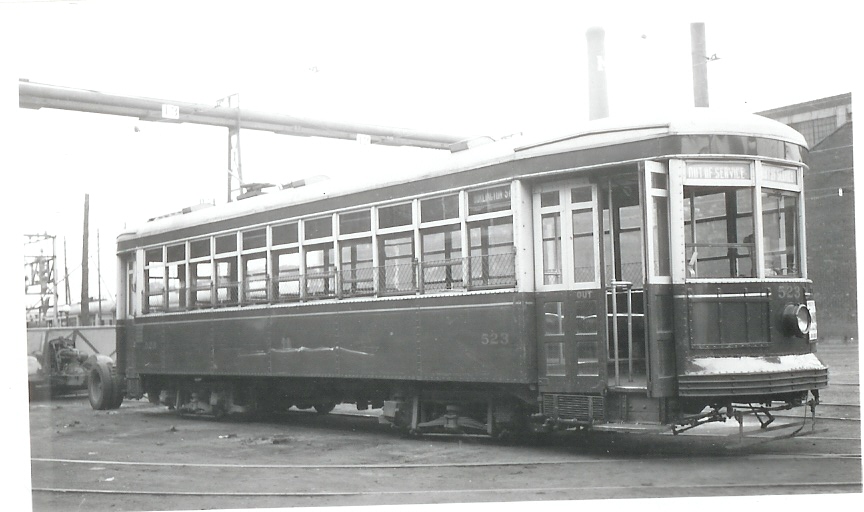 HSR #408 in the Sanford Yardin the late 1940s. It appears that it has already been used as a storage shed, but hasn't yet been fully converted (i.e. windows not boarded up) into a storage shed for road salt. (From Dave’s Electric Railroads.)