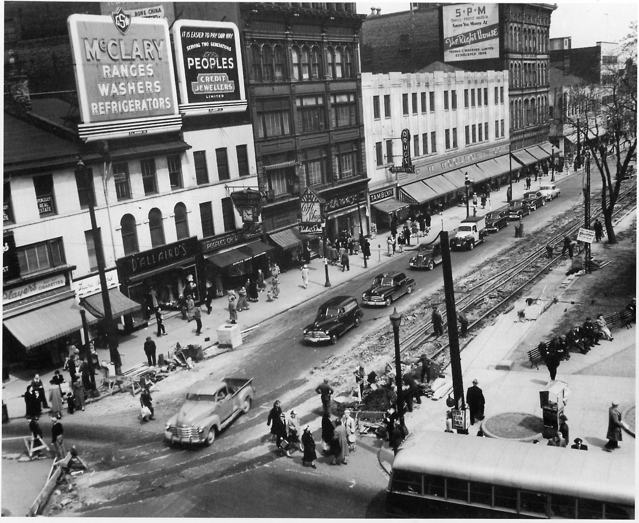 King St at Gore Park on VE Day. Notice in the foreground the condition of the streetcar tracks after years of neglect (Photo courtesy of the Hamilton Public Library, Local History & Archives, used with permission)