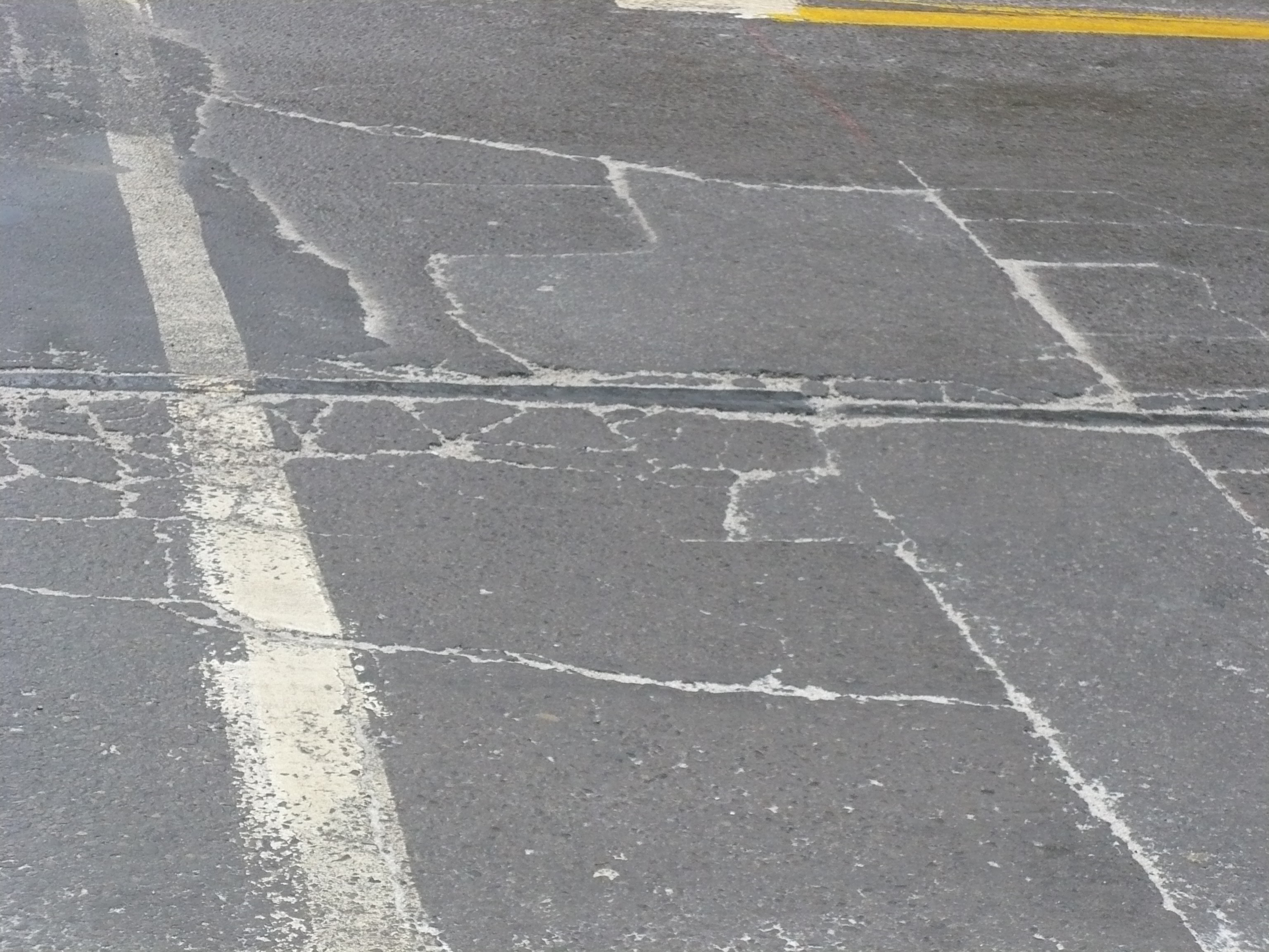 Old streetcar track working its way through the pavement at James & Bold, January 11, 2011. The street was repaved shortly after, but judging by the cracks in the pavement it's just a matter of time before the rail resurfaces