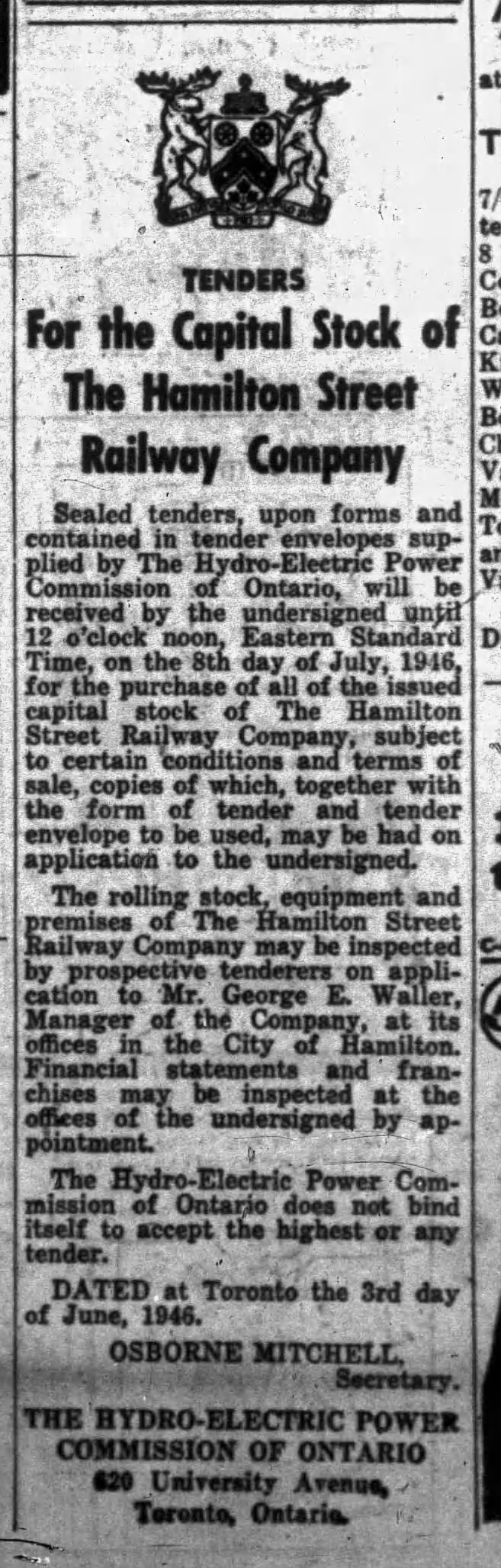 Call for tenders to buy the Hamilton Street Railway (From the Hamilton Spectator, June 4, 1946, pg 20)