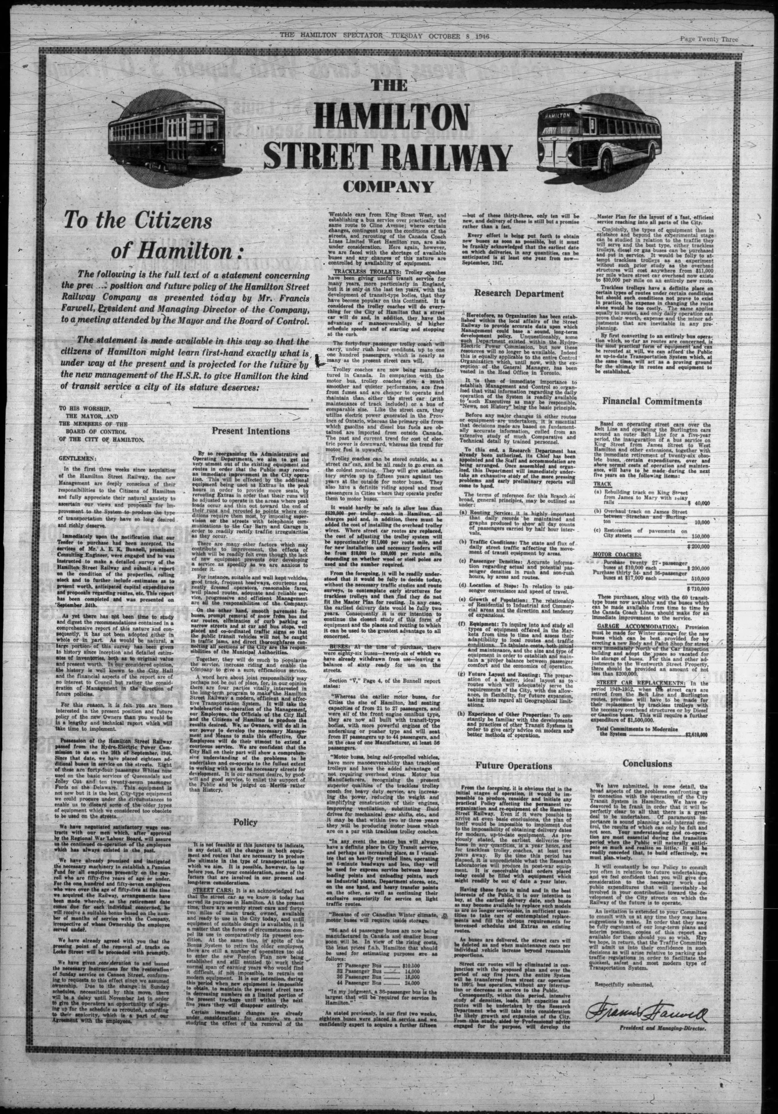 "Busses Will In Time Displace Hamilton Street Cars" October 8, 1946, pg 7