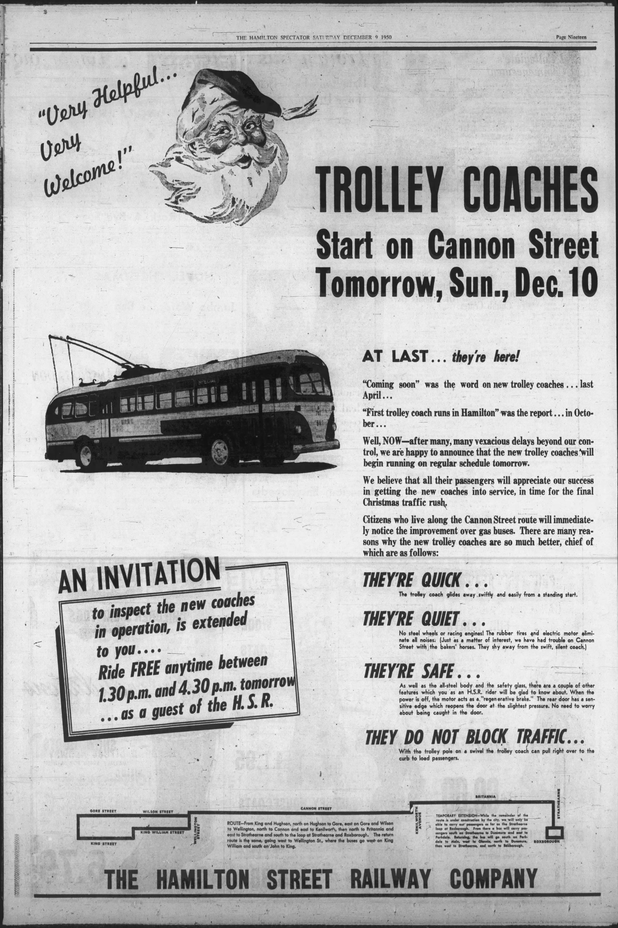 Announcement of opening of Cannon trolley bus (From the Hamilton Spectator, December 9, 1950, pg 19)