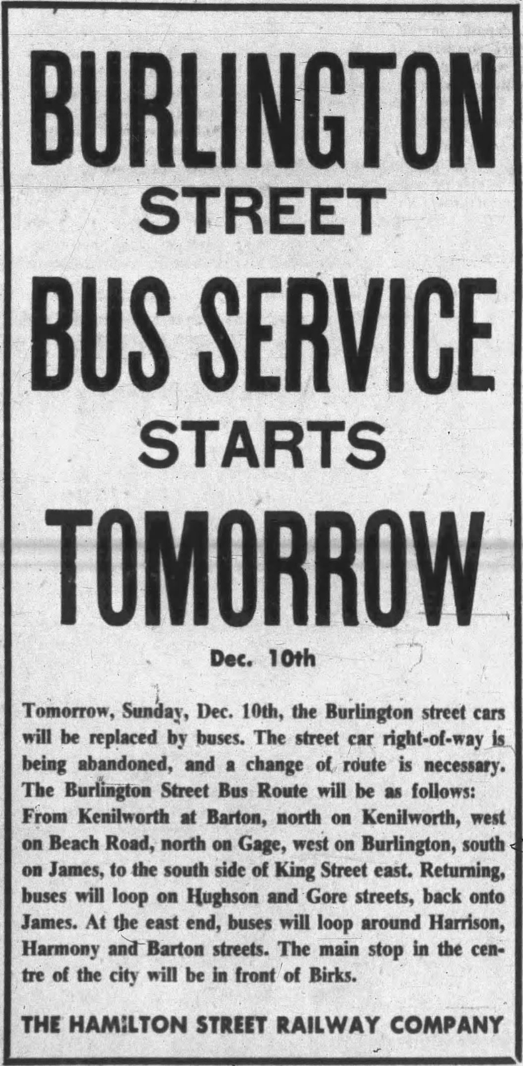Announcement of closing of Burlington streetcar and replacement with buses (From the Hamilton Spectator, December 9, 1950, pg 33)