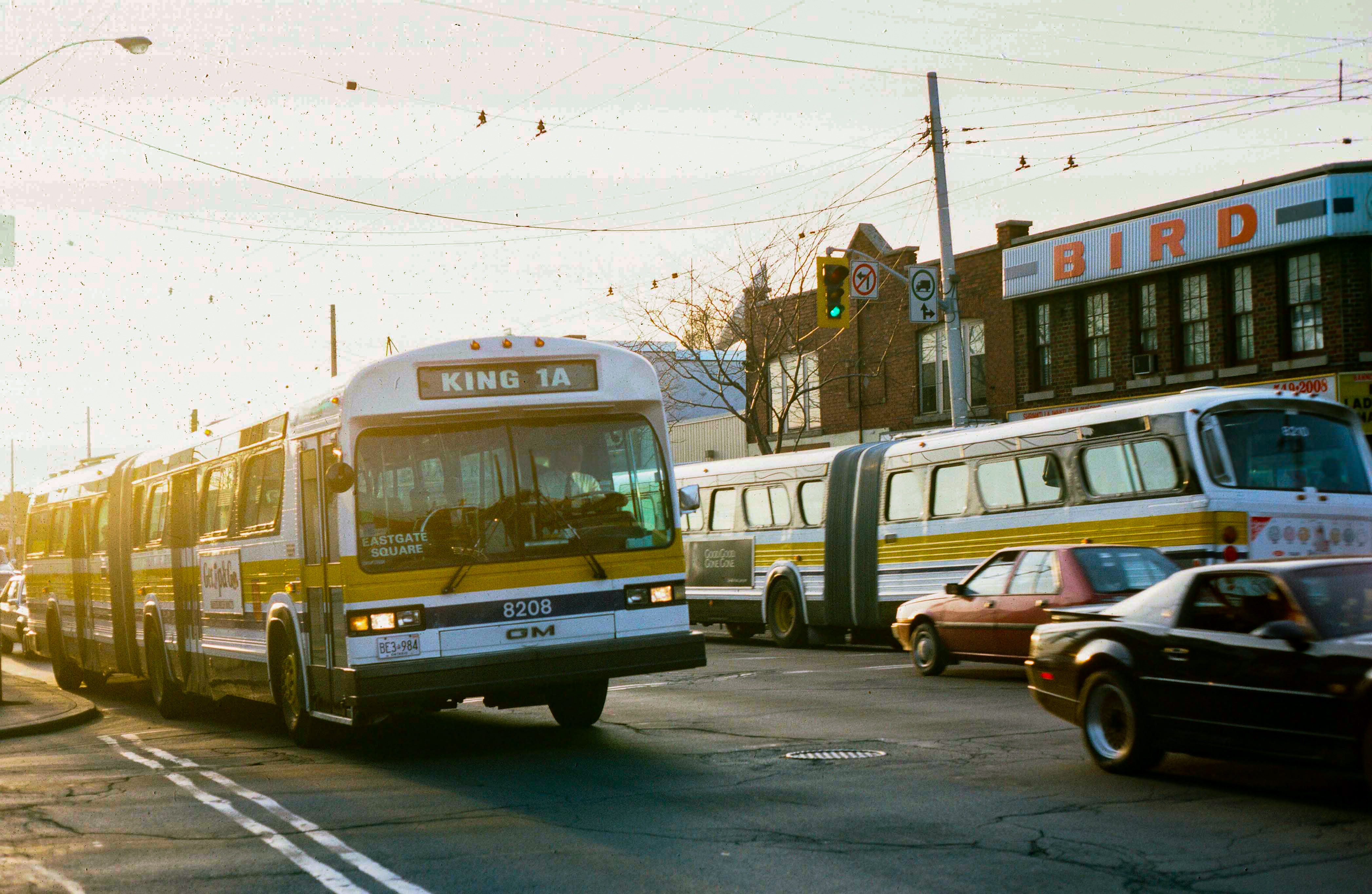 HSR #8208 and #8210 at King & Kenilworth, May 7 1988. (Photo by David L. Phillips, used with permission.)