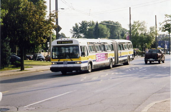 Guelph Transit leased HSR #8215 for a while in the early 1990s, to test whether or not these buses would be useful in Guelph. (Guelph decided not to acquire articulated buses). In the late 1990s Niagara Transit leased HSR #8210, #8212 & #8214 (and renumbered but not repainted them to NT #9748, #9749 and #9750). The HSR broke the lease with NT after two months when the HSR found itself short of buses after the 9100 series Orion V's were pulled off the road due to problems with the CNG tanks