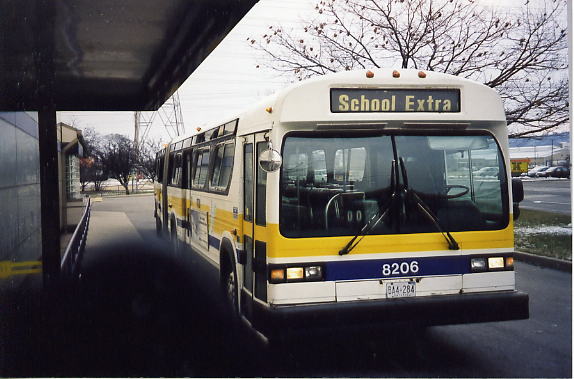 HSR #8206 leaving CNIB loop, heading east on Main St W as a school extra, Jan 18, 2002