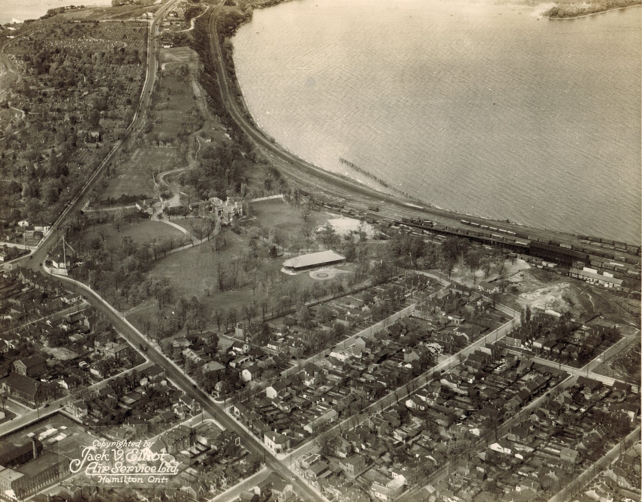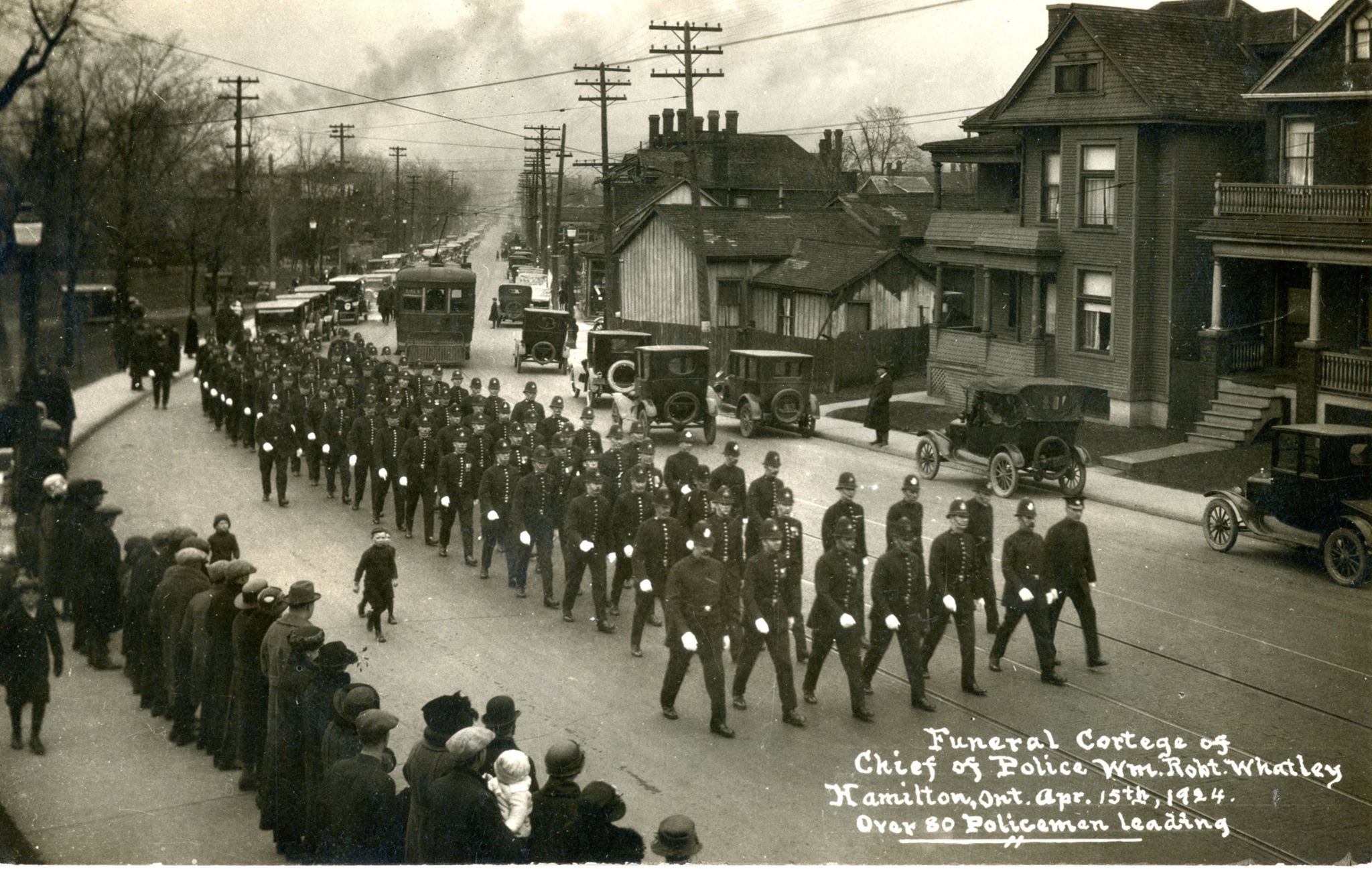 This funeral procession on York St approaching Dundurn on April 15th 1924 is for Chief of Police Robert Whatley. In the background is a Preston DEST streetcar on the York & King West route. (Photo from the Hamilton Police Service Archives)
