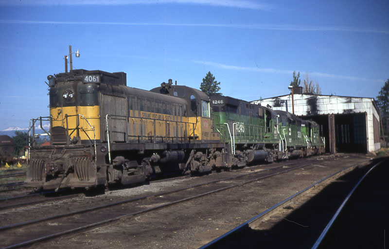 A collection of BN locomotives waiting their next assignment at the Bend enginehouse. Jerry Lamper photograph, used with permission. |