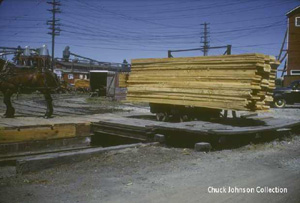 Two shots of horses pulling stacks of lumber on cars inside the mill complex.