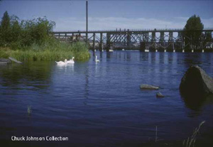 day put the horses out to pasture. Right:- Swans swimming in the Deschutes river near the sawmill.