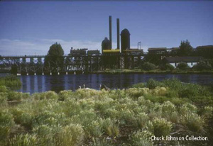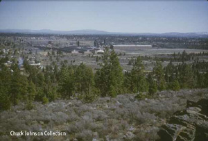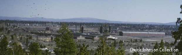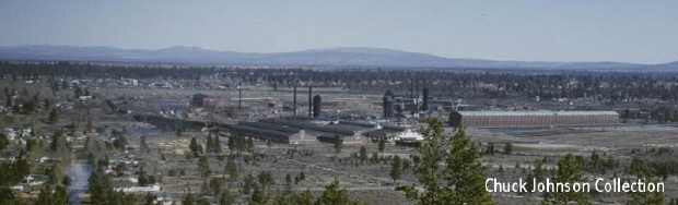 A panoramic shot of the Brooks-Scanlon sawmill complex. The southern edge of downtown Bend is just visible on the left side of the photo. |